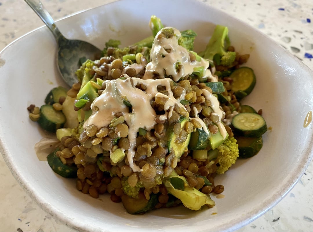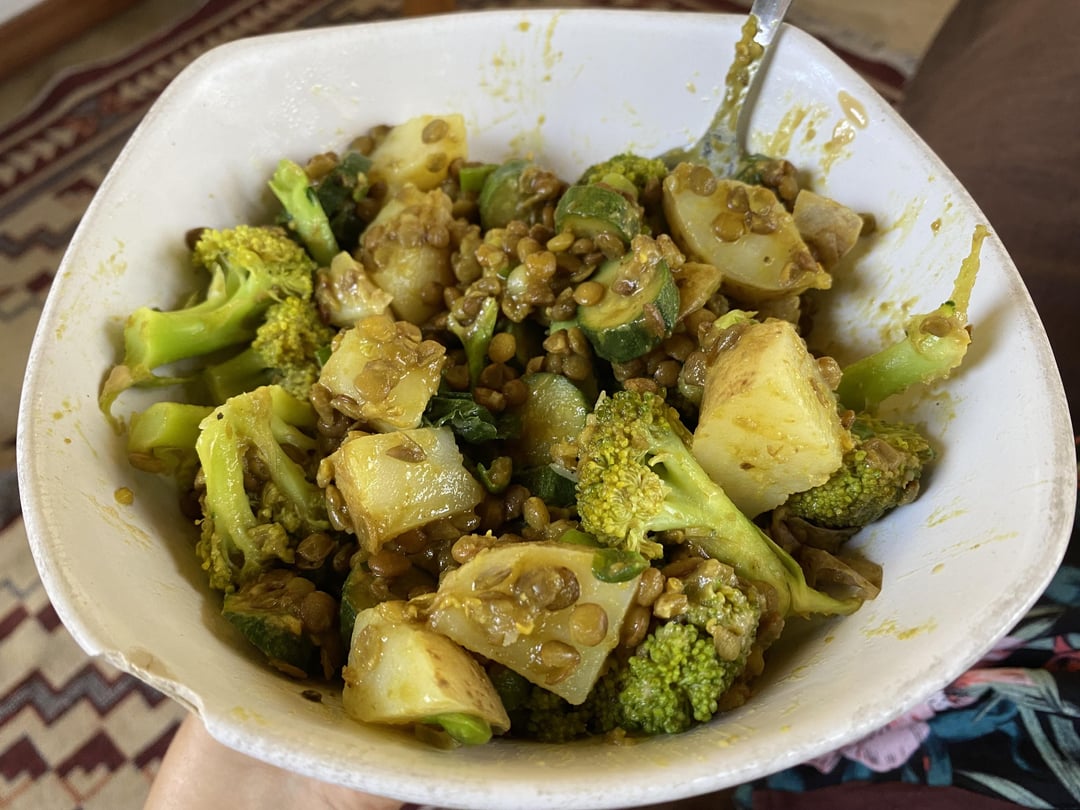 – steamed potato as a base – lentils or beans (spices can change, but I like mine simmered in vegetable broth/turmeric/garlic powder/onion powder) – steamed veggies (whatever you have on hand! This photo had broccoli, zucchini, spinach and spring onions. Other times I use carrots, red cabbage, peppers, etc) – some kind of fat (a drizzle of tahini is really nice, avocado works well too!)