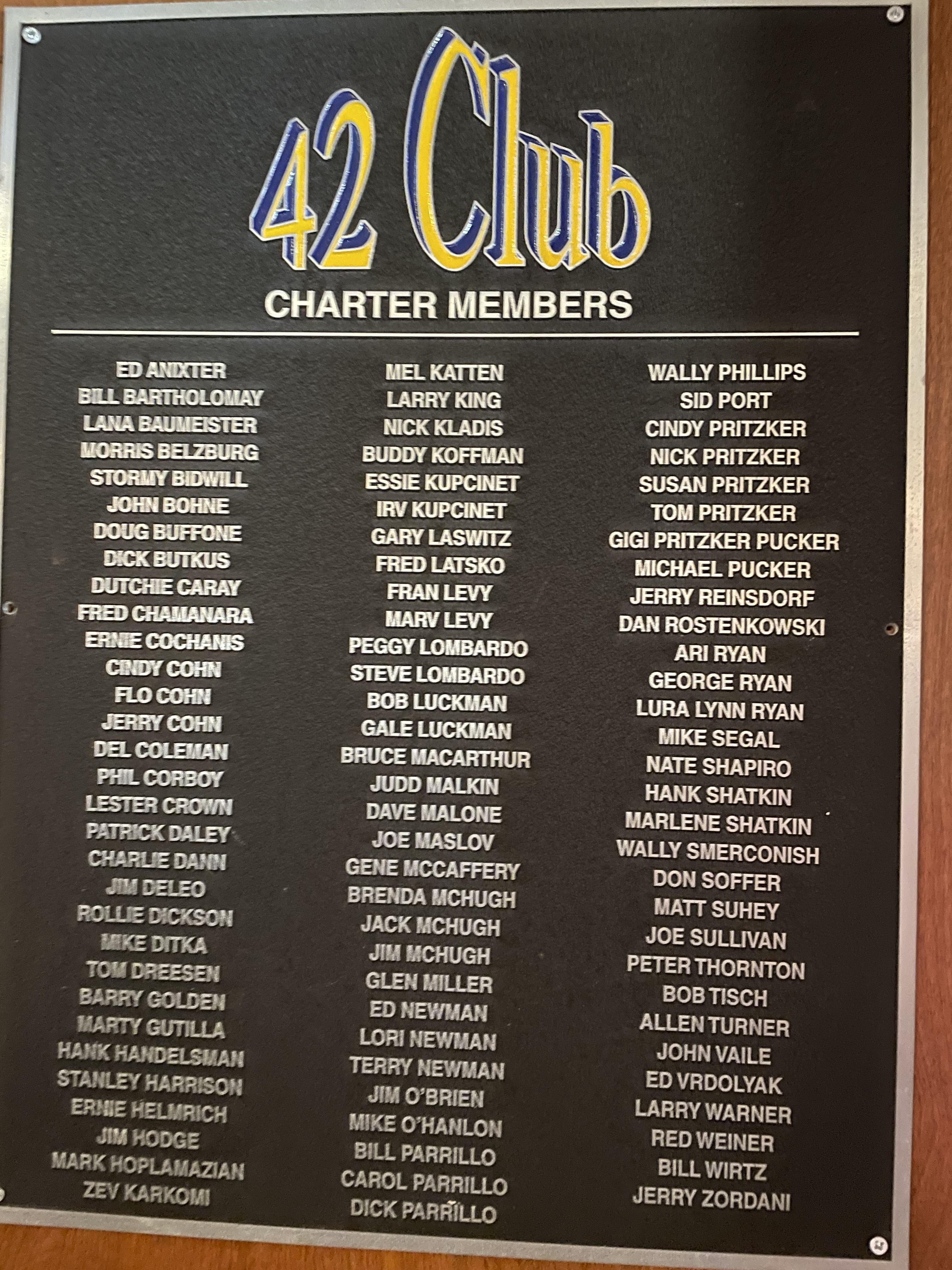 The private dining room upstairs at Gibsons is Club 42, named after Sid Luckman’s jersey number. by isellusedcars 8 Comments JimShorts365 2 years ago Wow! That is definitely a who’s who of 80’s Chicago royalty grrgrrtigergrr 2 years ago I loved Matt Suehy, but he really strikes me as odd to be on this list. asstro_not 2 years ago Look at all those Pritzkers. WP_Grid 2 years ago Small handful of felons on that list among others wilcojunkie 2 years ago Dan Rostenkowski 👀 chanceofsnowtoday 2 years ago I don’t recognize all the names, but…..https://www.youtube.com/watch?v=YHi3FD4o-S8 shartytarties 2 years ago Red Weiner? chi2005sox 2 years ago Fuck Jerry Reinsdorf.Write A CommentYou must be logged in to post a comment.