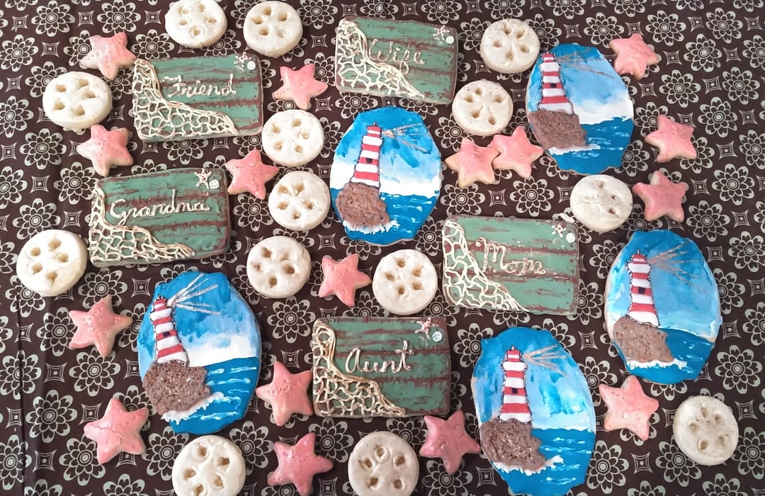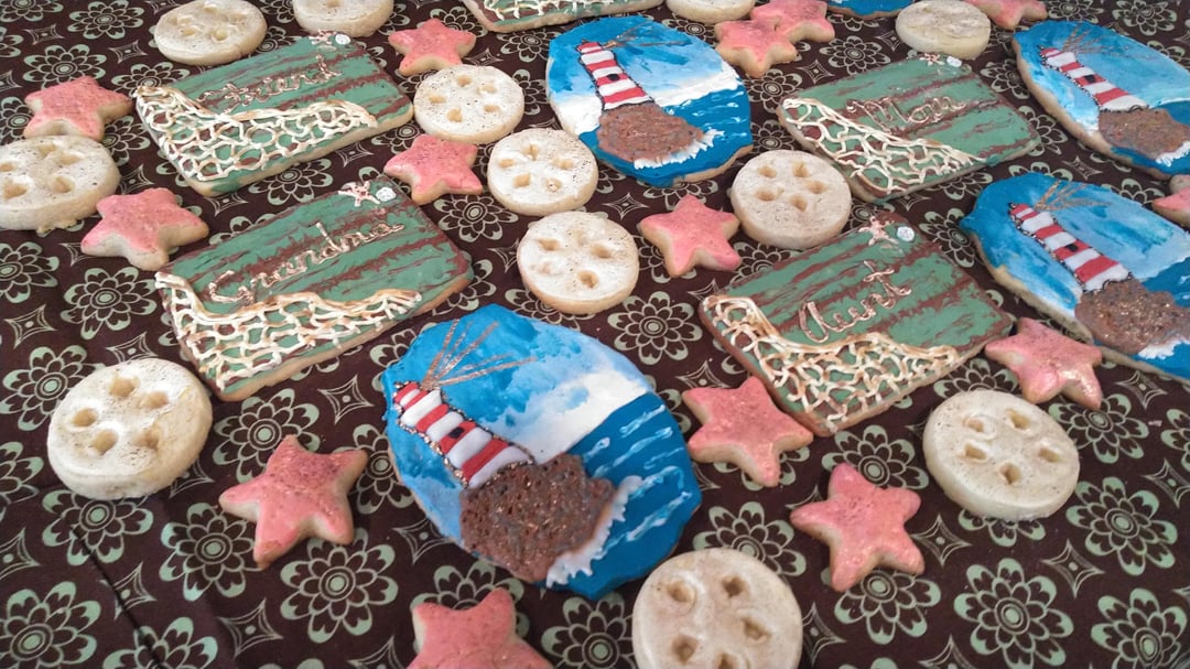 She loved lighthouses. The smaller cookies, I baked the icing on, hoping for the crinkle effect, but it raised and flaked so I’ll probably redo the sand dollars.