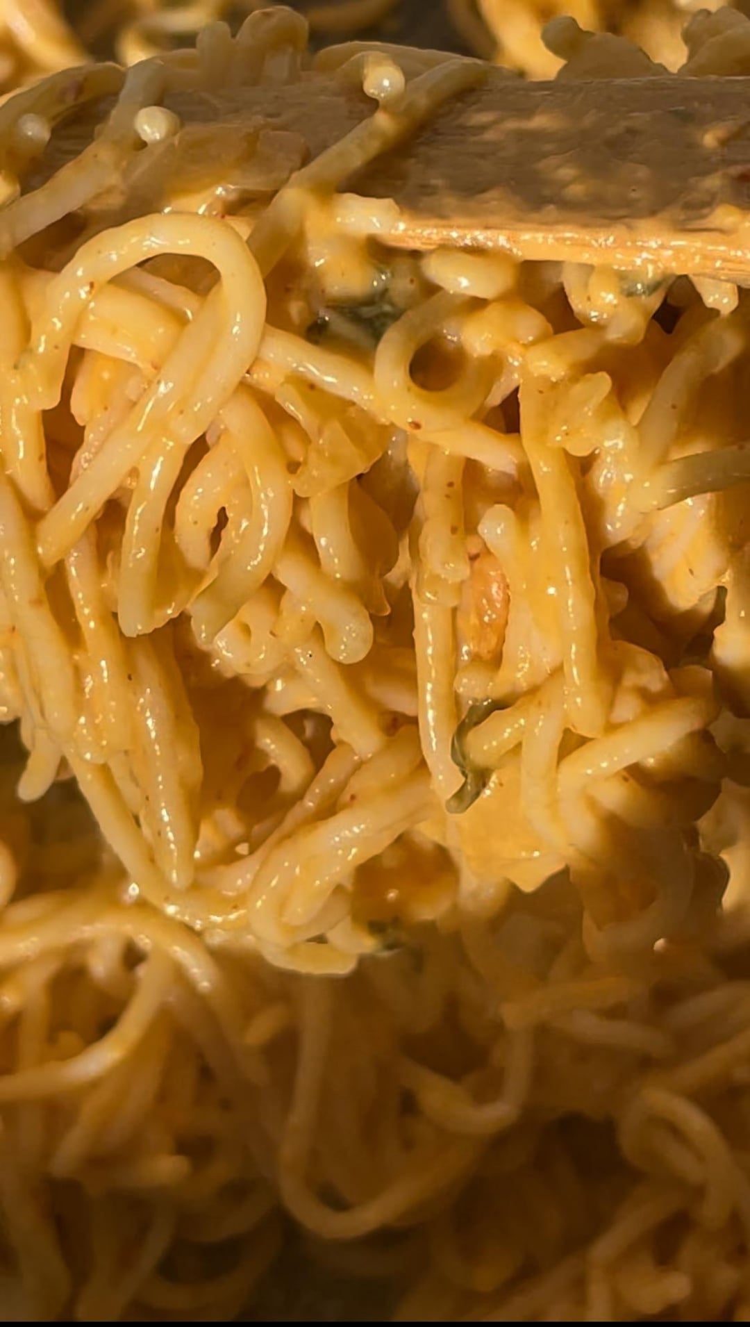6. Begin to stir to combine. It will feel a little difficult to stir so be brave haha. Add in pasta water to get everything nice and creamy helping to combine. We finish cooking the ramen at this stage so before taking it off the heat taste and make sure it is that yummy chewy texture. This only takes a few minutes! Adding more pasta water as needed to keep things juicy.