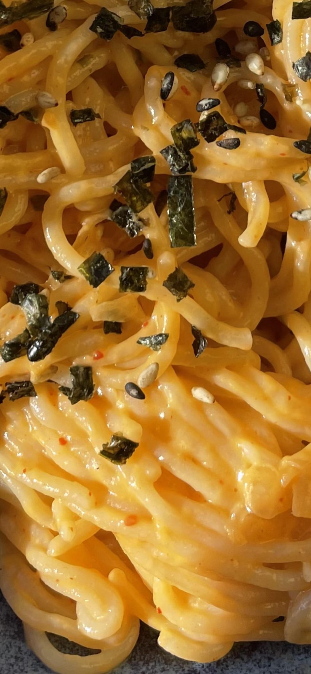 Directions: 1. First prepare ‘cheese’ sauce. Set your oven to high broil. Put red bell pepper on cooking pan and blister on all sides turning every 3-5 minutes. You’ll just want to keep an eye on this as oven temperatures vary. Basically you want it blistered on each side! Remove from oven and place in a bowl covered for 10 min. Take out and remove outer blistered skin. Destem and deseed. 2. Add red bell pepper in a high speed blender along with all other ‘cheese’ ingredients except for the tapioca starch. Blend and taste. At this point you will add more olive brine and salt to taste until you reach flavor town. Did a couple pinches more of salt and a splash or so of brine. Once you enjoy the flavor add in tapioca starch to blend. 3. Add blended sauce to a saute pan over medium heat. Continue to stir until sauce thickens and is no longer liquidity like when you first started. Won’t take long! About 2-5 min. Remove from heat and set aside in container. 4. Bring a pan of salted water to a boil and add in your ramen noodles. Cook for 2 minutes. After 1 minute begin to gently separate noodles with a fork. Setting aside at least 1 cup of that pasta water. Drain. 5. Over same pan on medium to medium low heat add in kimchi to cook for about 30 seconds. Add back in noodles along with some of that cheese sauce. This is all to taste! Can always start with a smaller amount and add from there if you are feeling a little unsure. Just taste as you go! 6. Begin to stir to combine. It will feel a little difficult to stir so be brave haha. Add in pasta water to get everything nice and creamy helping to combine. We finish cooking the ramen at this stage so before taking it off the heat taste and make sure it is that yummy chewy texture. This only takes a few minutes! Adding more pasta water as needed to keep things juicy. 7. Season with a couple drops of sesame oil and combine! 8. Put in bowl and sprinkle some nori furikake on top!! Enjoy guys 🤩