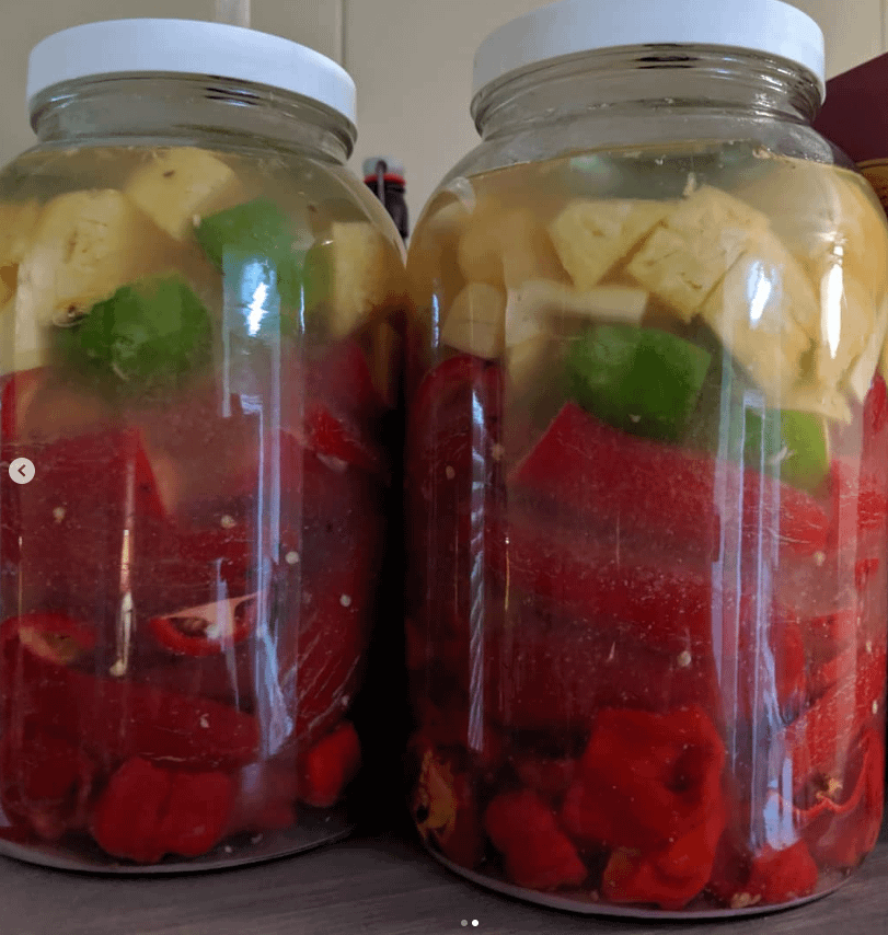 The most surprising thing is that the heat was manageable for most of my friends. Pineapple and time really did cut down on the intensity of the heat. This was in two 1-gallon jars, and there were 9 Carolina Reapers. We used it in everything from eggs to salsa to ramen.