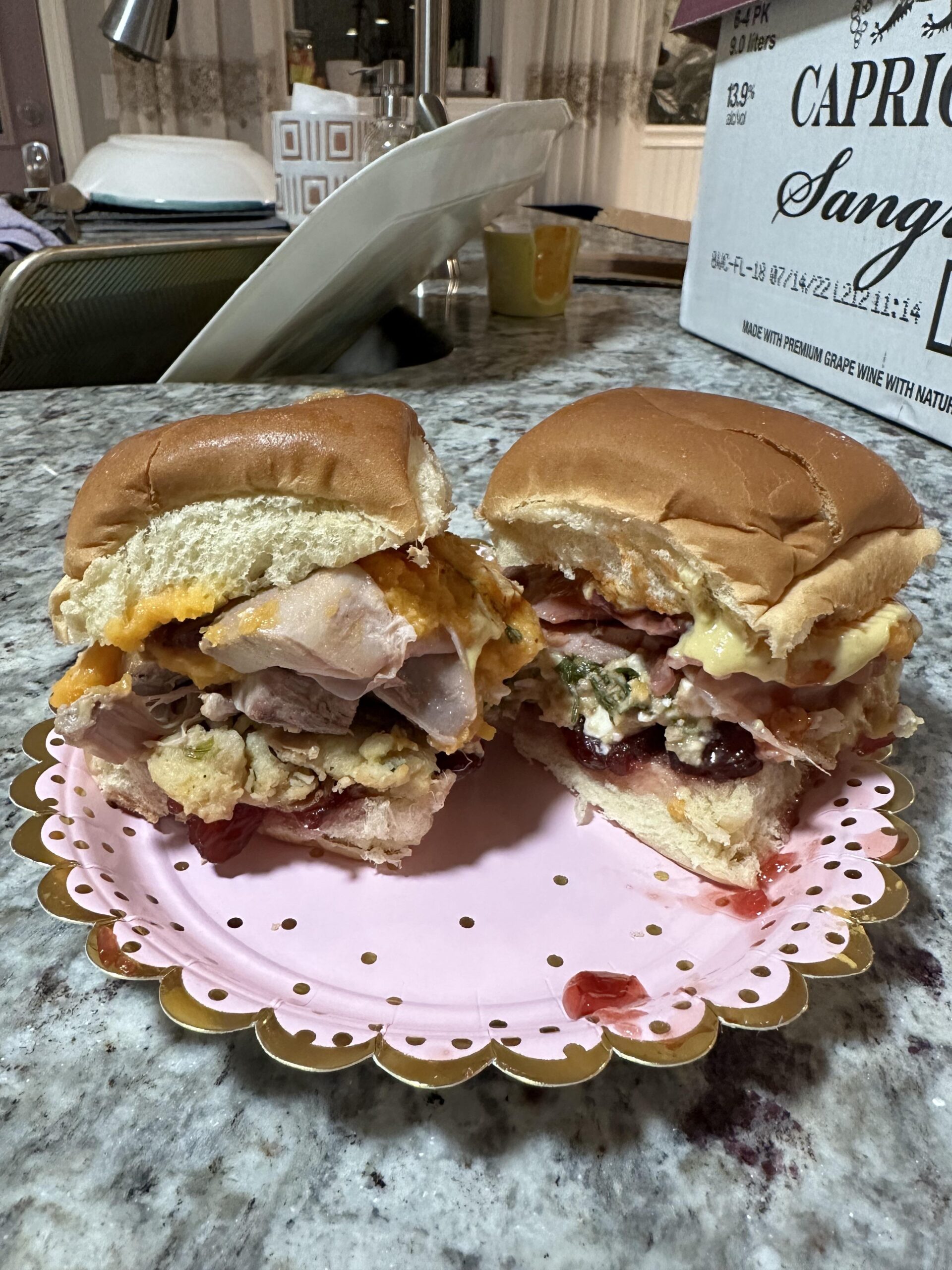 Literally just crushed my leftover sammy. Open-faced on dinner rolls with all the fixins and topped with gravy.