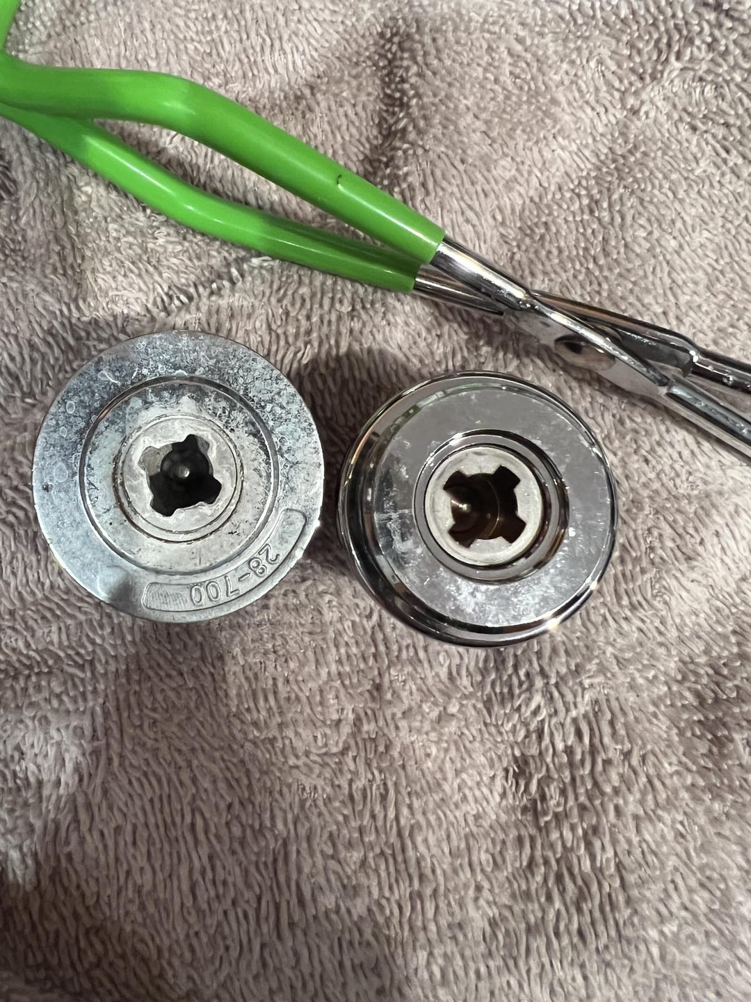 Edit: I see the cone in the second pic, I think you just need to push it on with a little more force. They don’t just drop on unless they’re as well used as the original one maybe does. they sort of clip on.