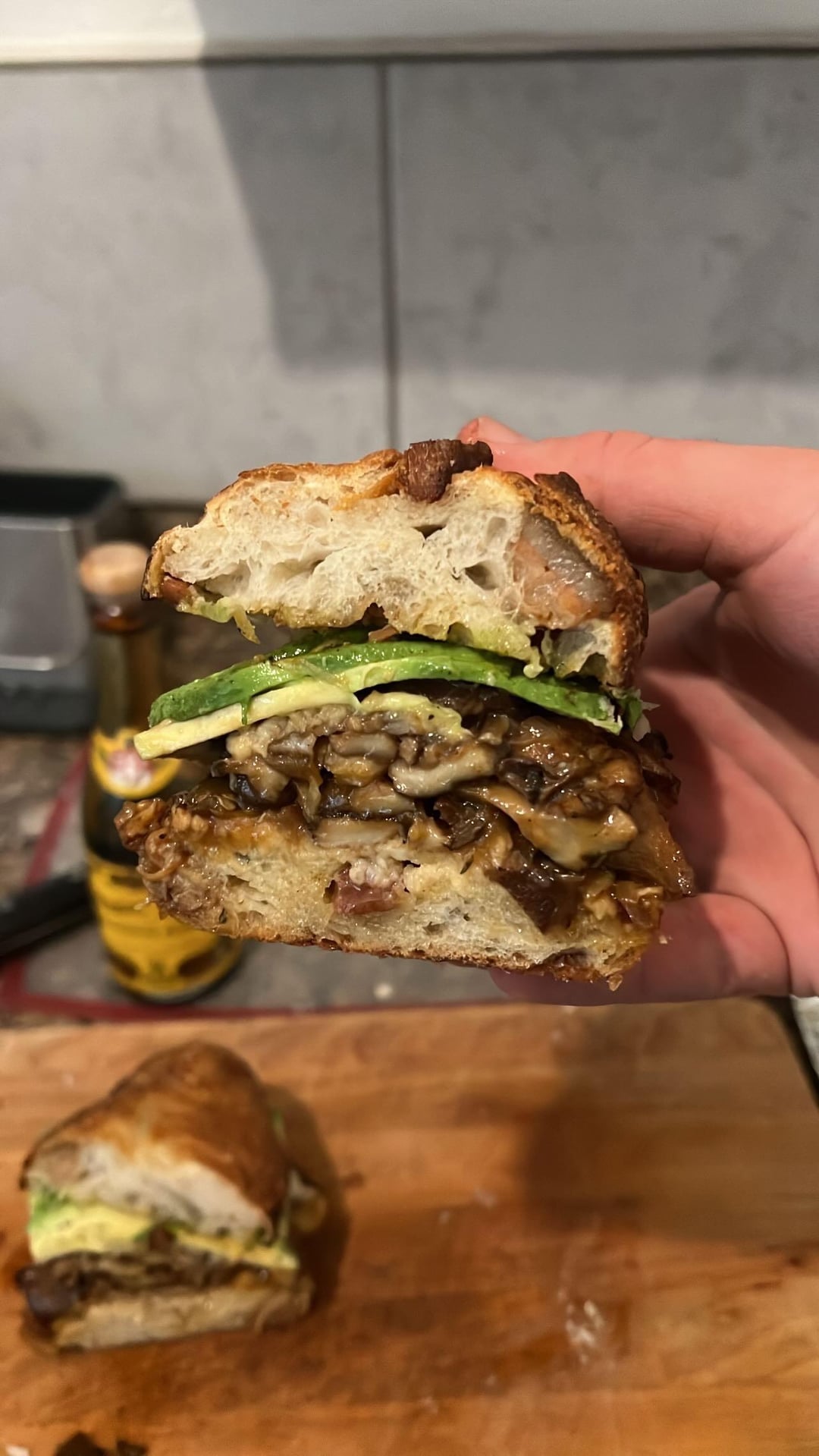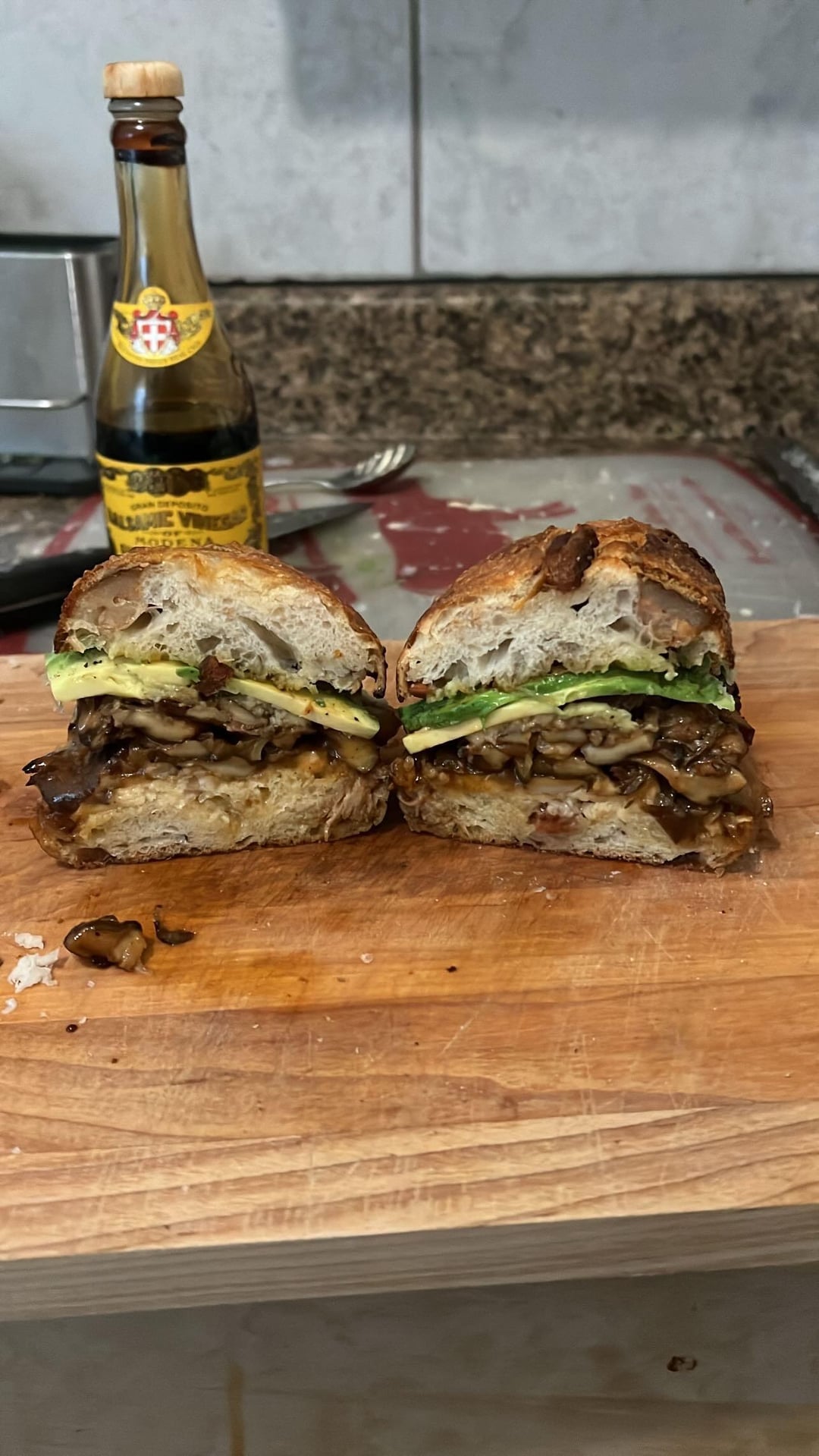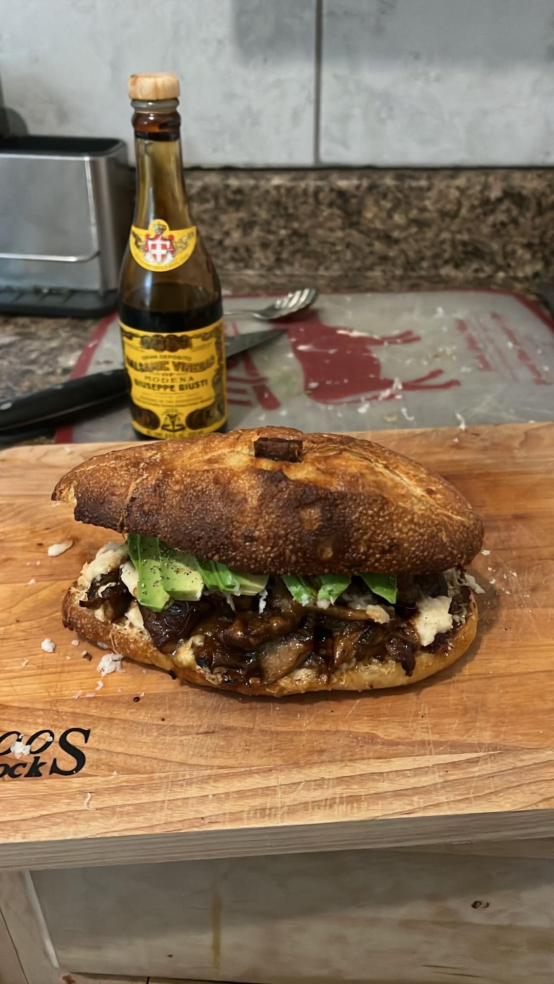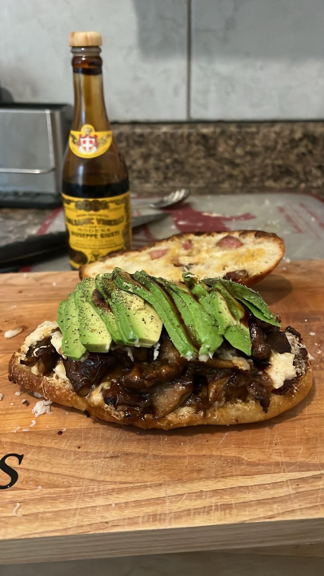 Shiitake mushroom melt on a bacon lardon and Gruyère baguette with midnight moon goat Gouda, medjool date, avocado, and 15yr balsamic
