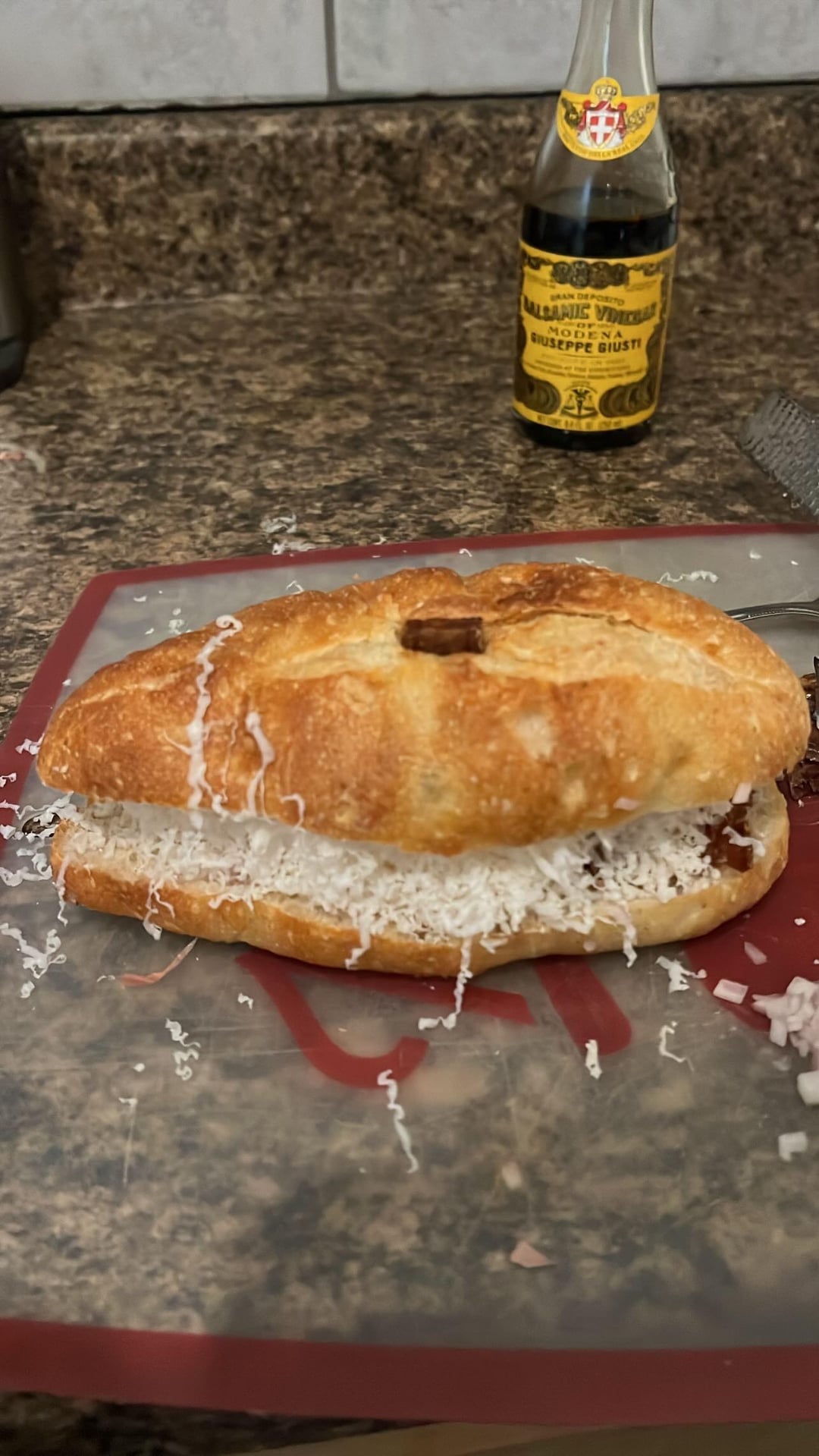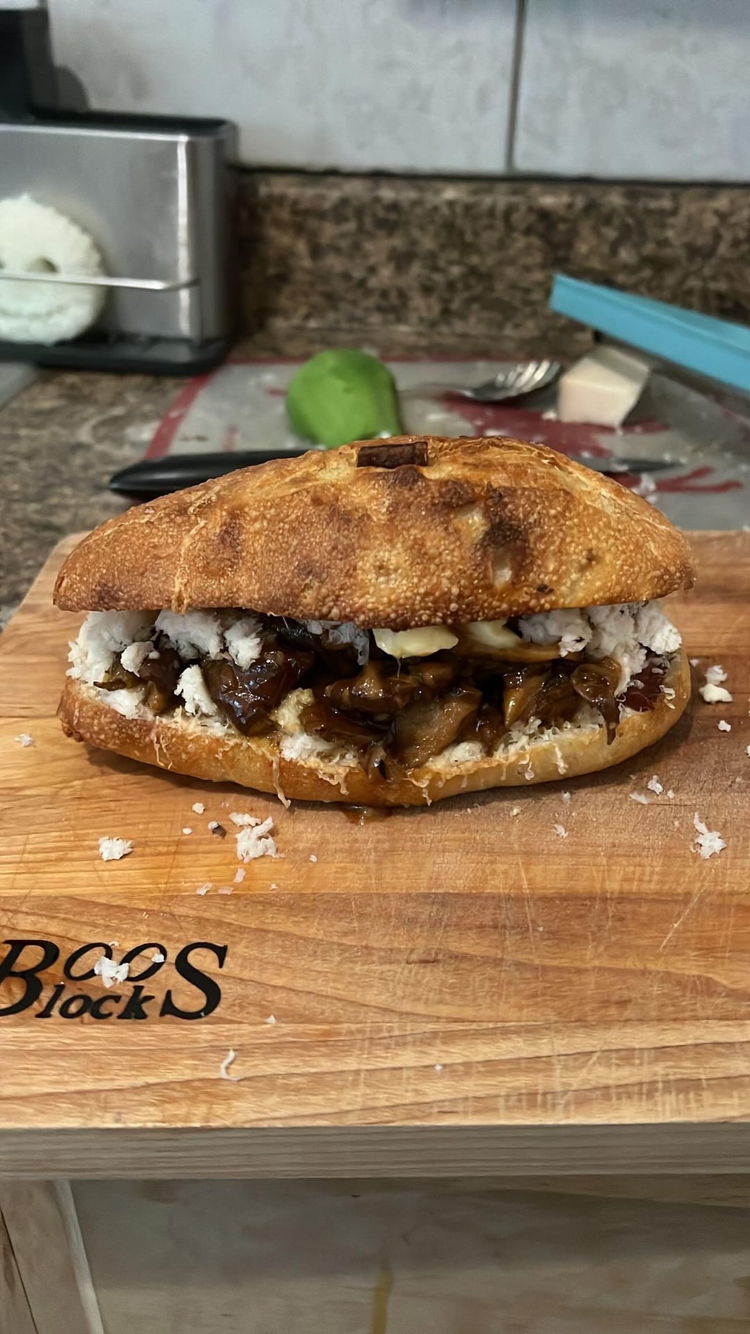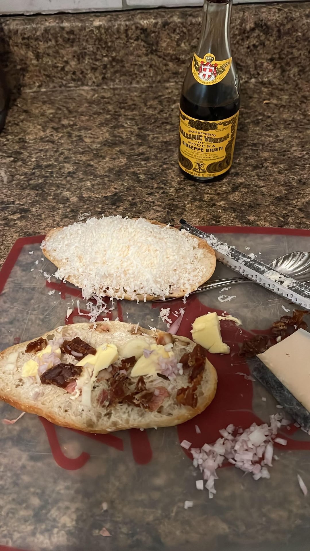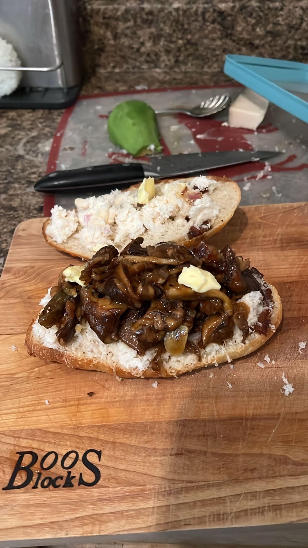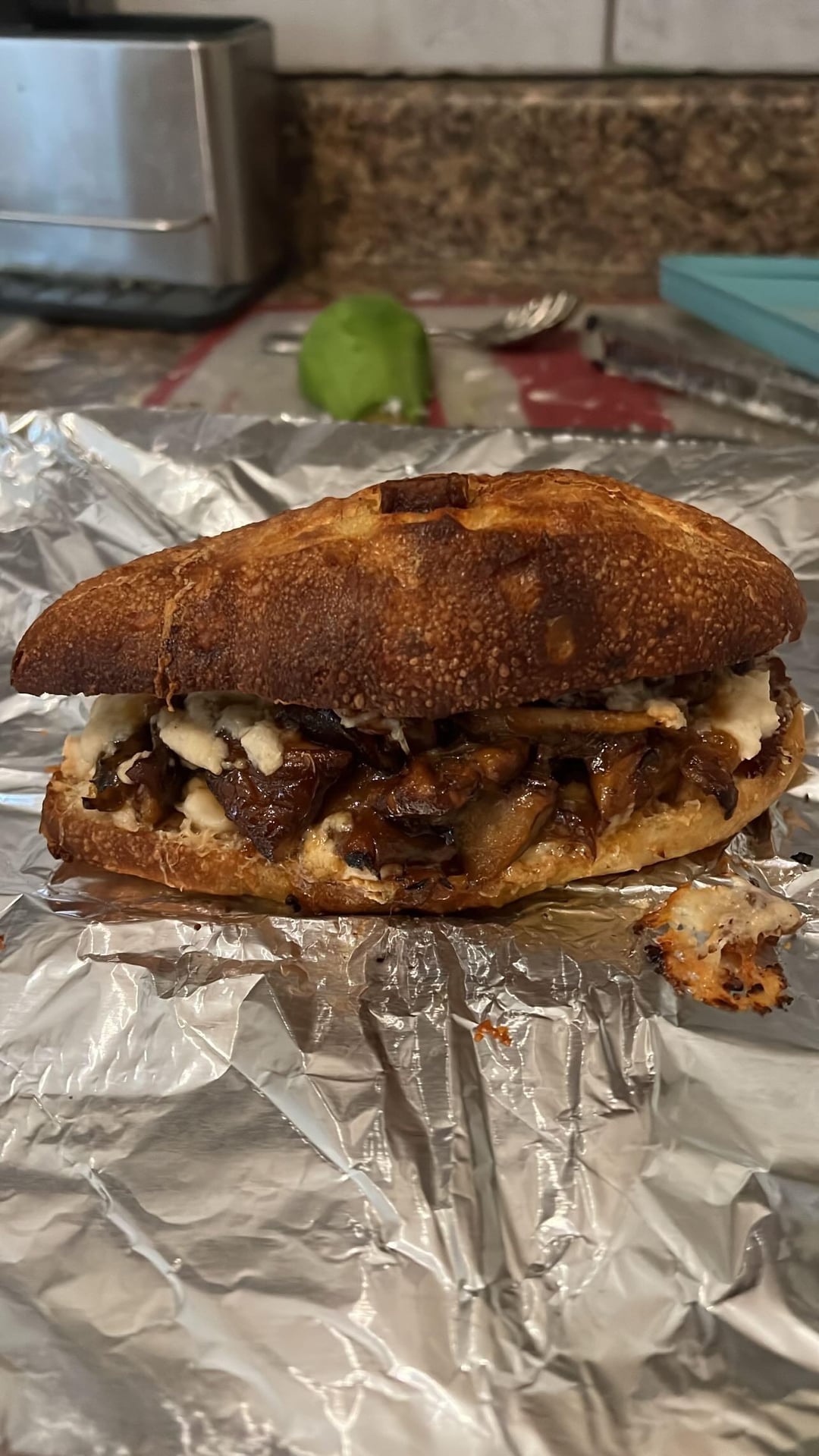 Shiitake mushroom melt on a bacon lardon and Gruyère baguette with midnight moon goat Gouda, medjool date, avocado, and 15yr balsamic