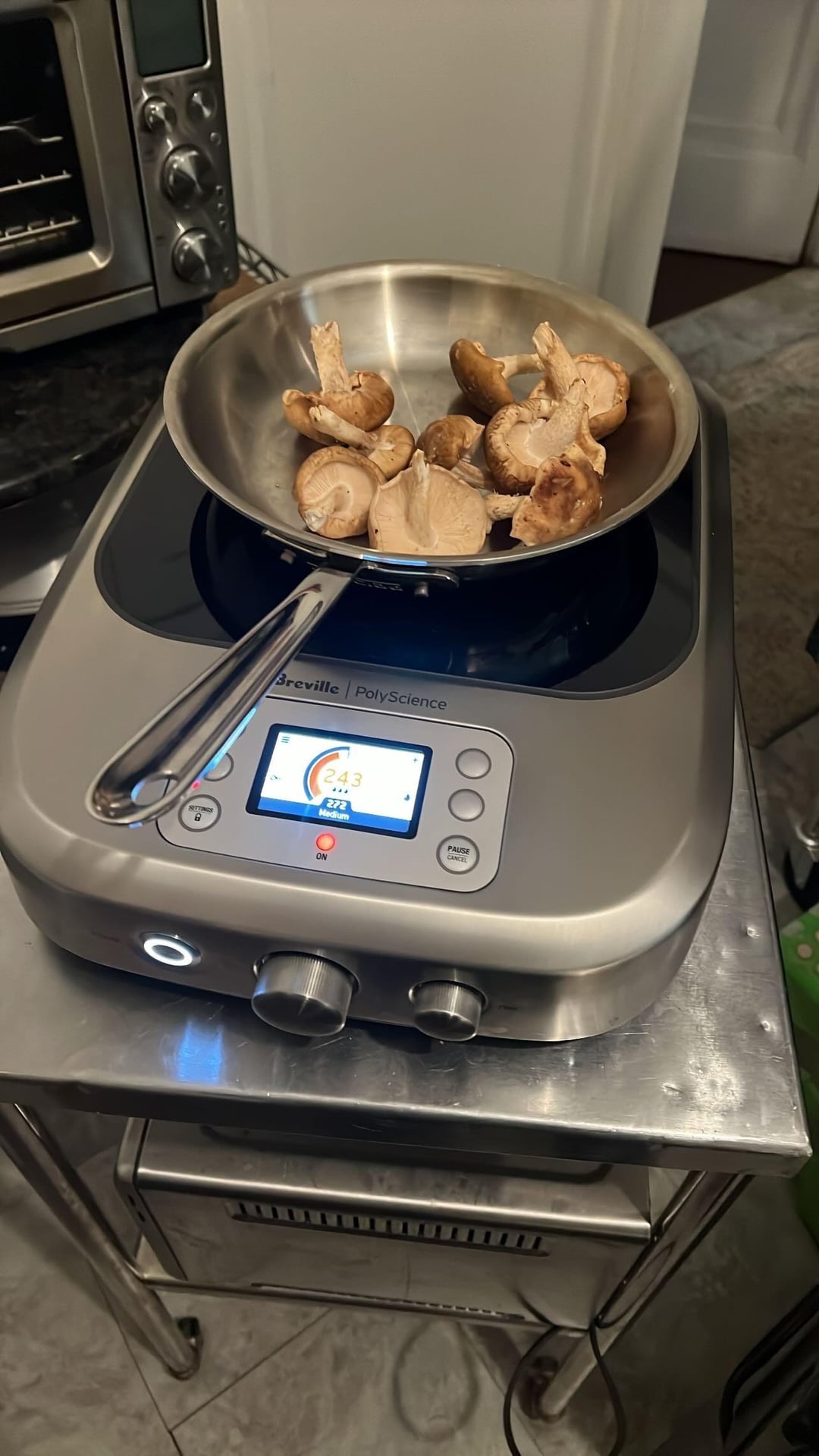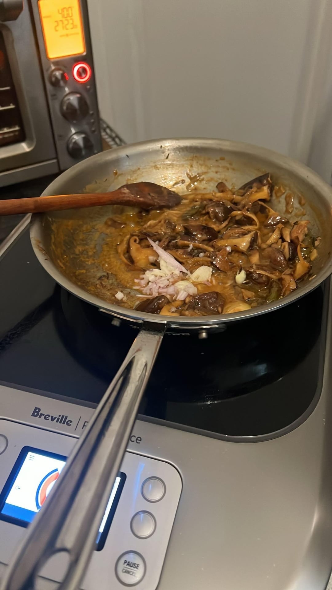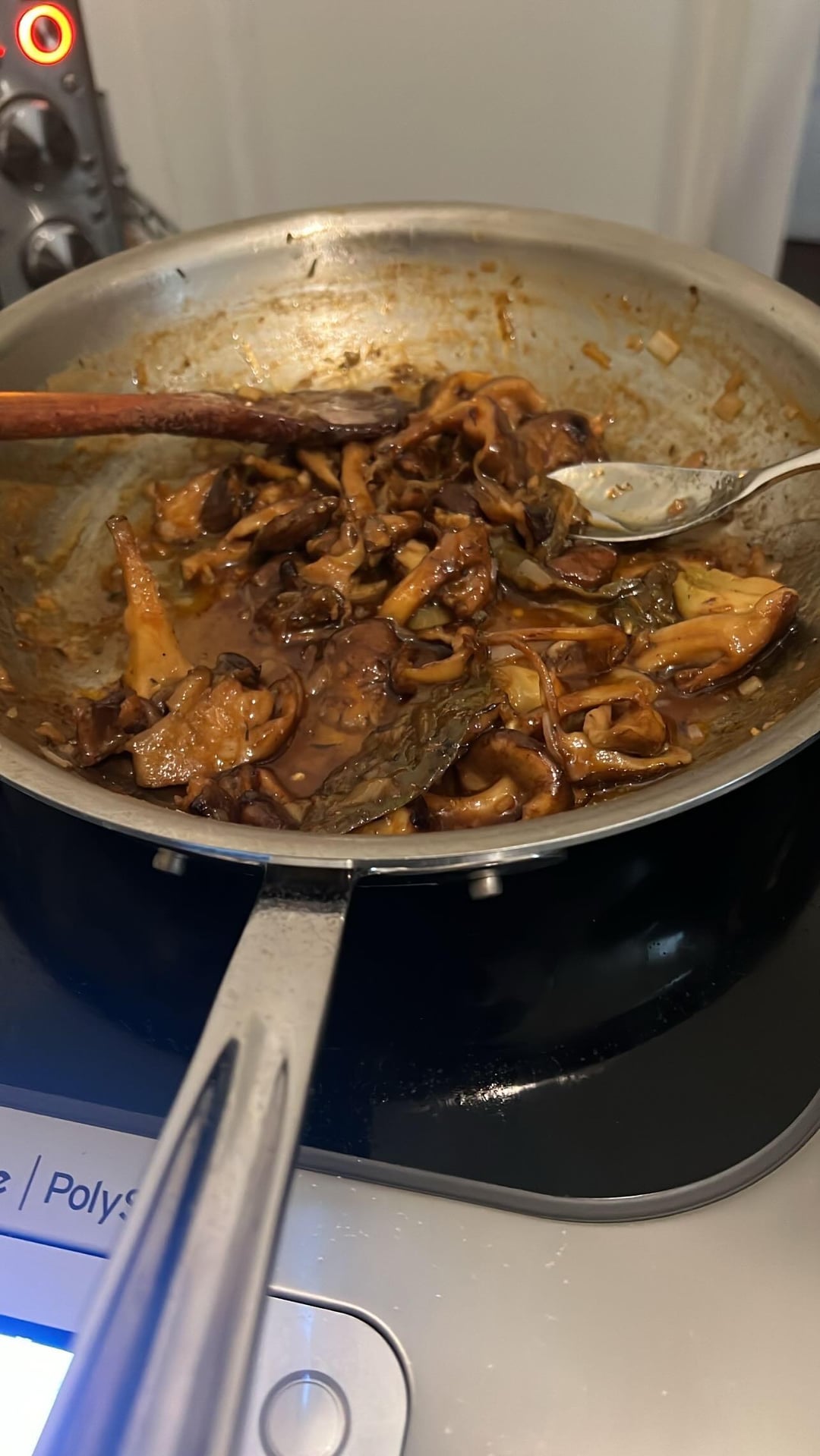 Shiitakes cooked with garlic, shallot, bay leaf, gochugaru, coriander, thyme, chicken stock, sambal oelek garlic sauce, pepper, maldon salt, evoo, lehua blossom honey, balsamic vinegar, and isigny butter