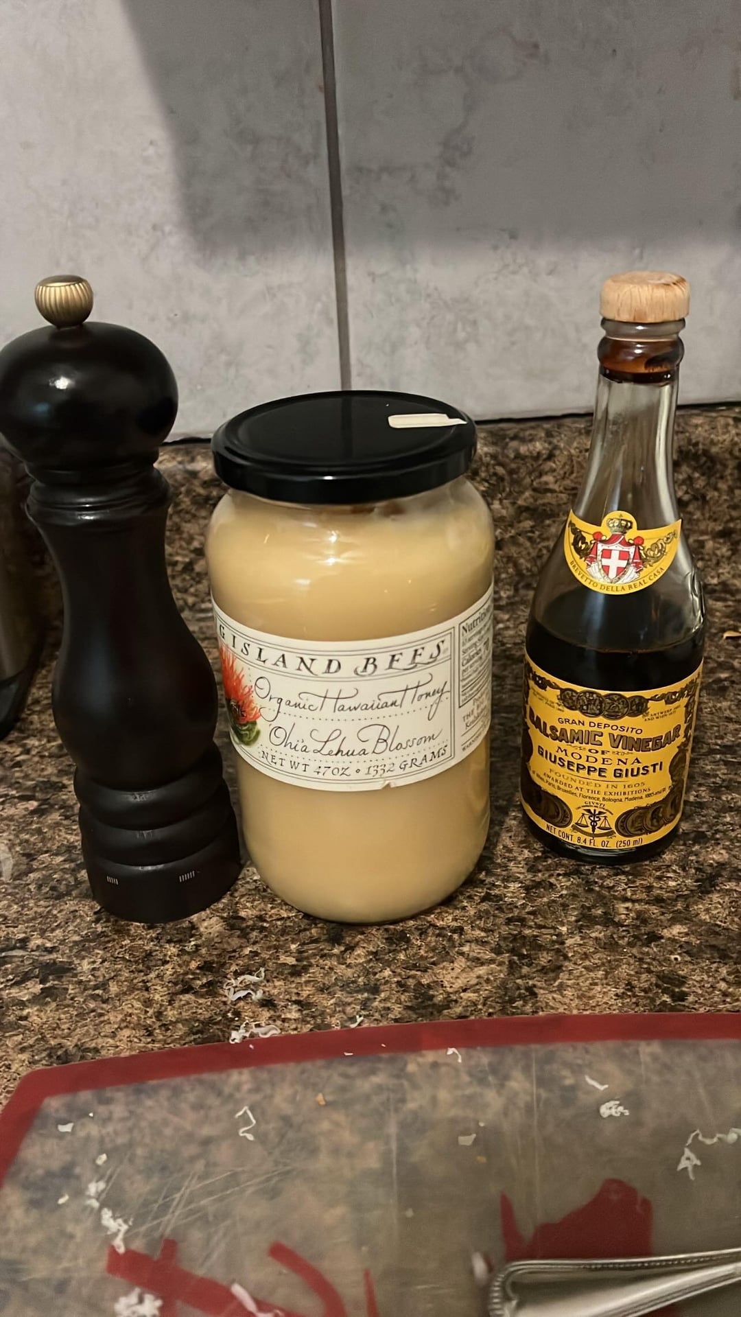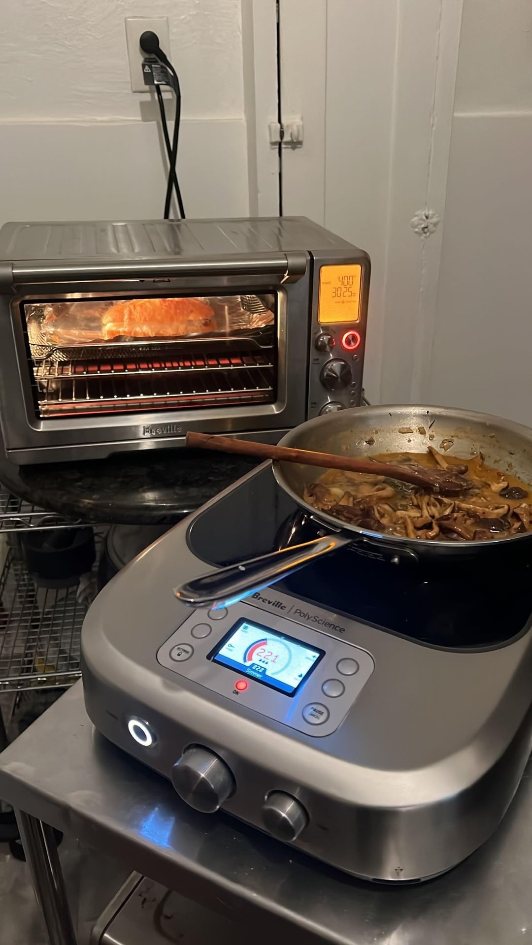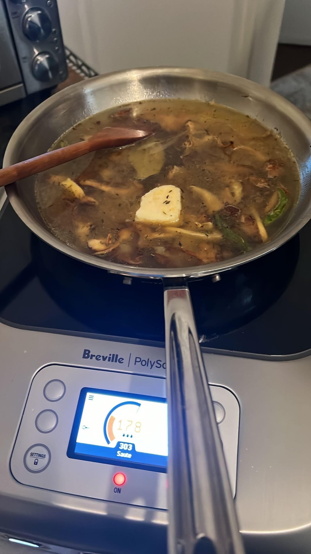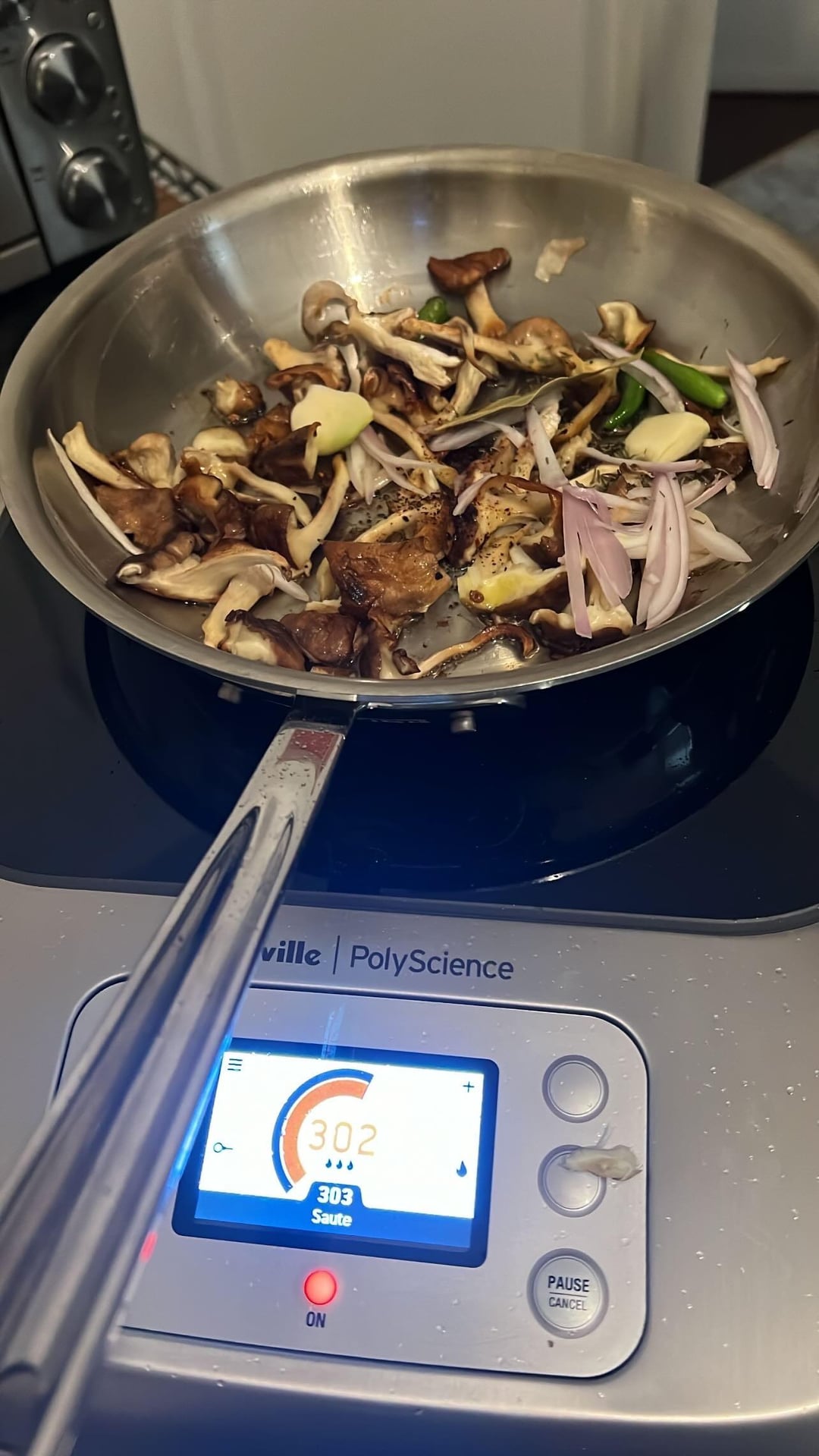 Shiitakes cooked with garlic, shallot, bay leaf, gochugaru, coriander, thyme, chicken stock, sambal oelek garlic sauce, pepper, maldon salt, evoo, lehua blossom honey, balsamic vinegar, and isigny butter