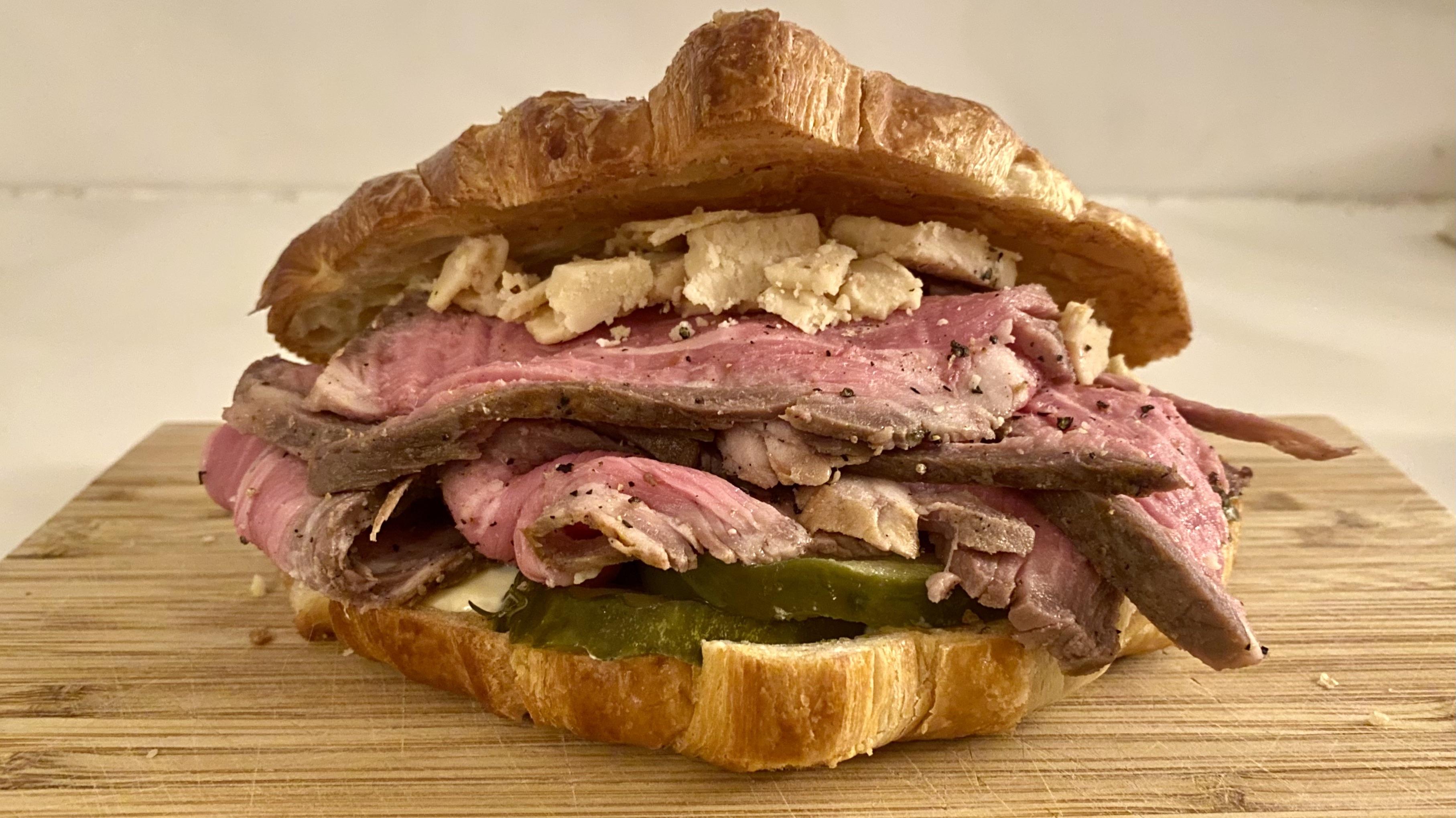 Leftover Thanksgiving roast tri-tip, dill pickles, caramilized-onion cheddar, kewpie mayo on a butter croissant.