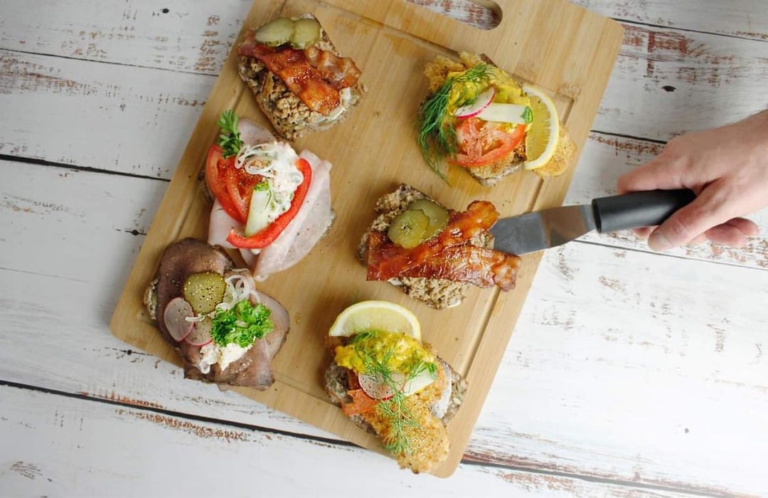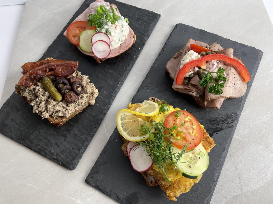 1: Open faced sandwiches (Smørrebrød) on homemade danish rye bread (clockwise from top right; Ham w. “Italian salad”, roast beef w. Horseradish cream, fish fillet with remoulade, homemade liver pate w. Mushrooms & bacon).