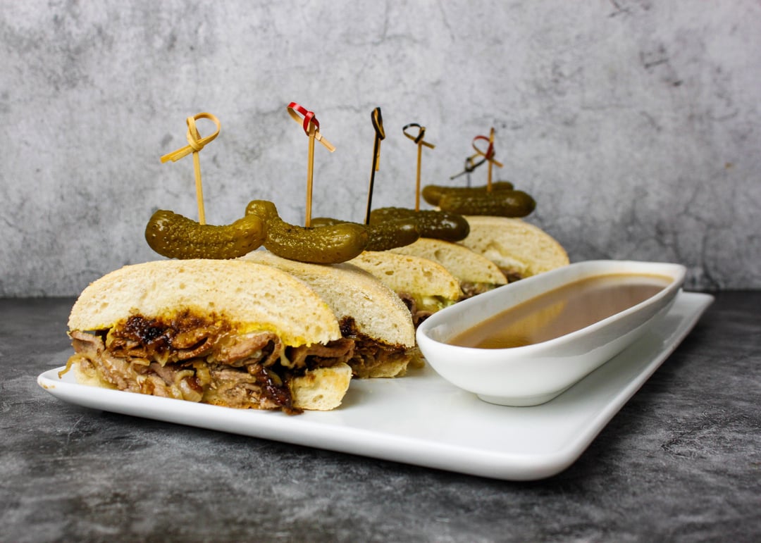 6: French dip sandwiches with gruyere and caramelized onion on potato rolls.