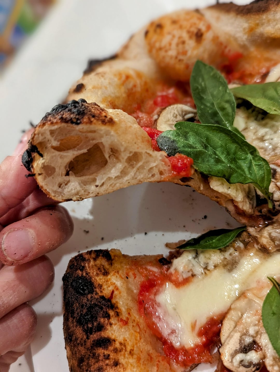 That looks really good. Sourdough pizza is amazing. I work at a woodfired sourdough pizza restaurant and it is my favorite style of pizza to work with so fat. The amount of oven spring and the way the cornicione develops is incomparable.