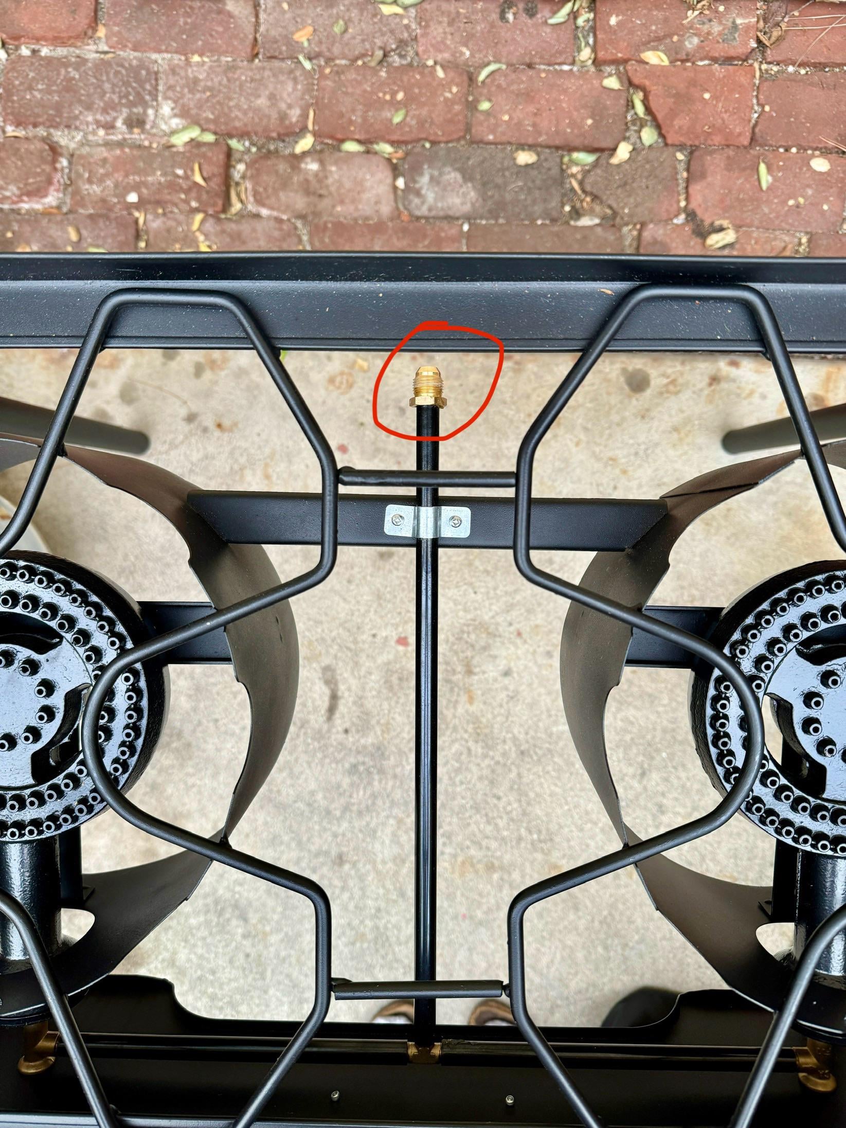 Did a leak test on my outdoor portable double propane burner stove, and there is a small leak at the inlet (circled in red above), where the gold colored metal meets the black pipe.