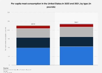 The United States had an average per-capita meat and poultry consumption of 99 pounds of chicken, 59 pounds of beef, and 52 pounds of pork. And they’re [we’re] projected to eat 10 more pounds of all three combined in 10 years [https://www.statista.com/statistics/189222/average-meat-consumption-in-the-us-by-sort/]