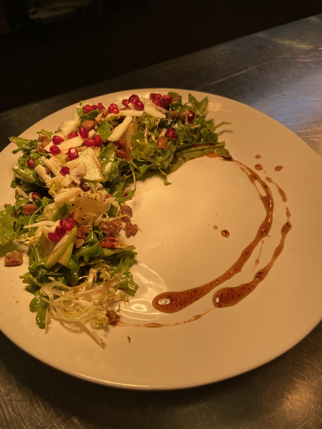Diced Duck Breast, Arugula & Frisée tossed with Bacon Fat & Apple Cider Gastrique Vinaigrette, Candied Walnut, Pomegranate Seed, Green Apple Quarter Slices, Pecorino w a drizzle of the Apple Cider Gastrique to fill out the ‘circle’ shape
