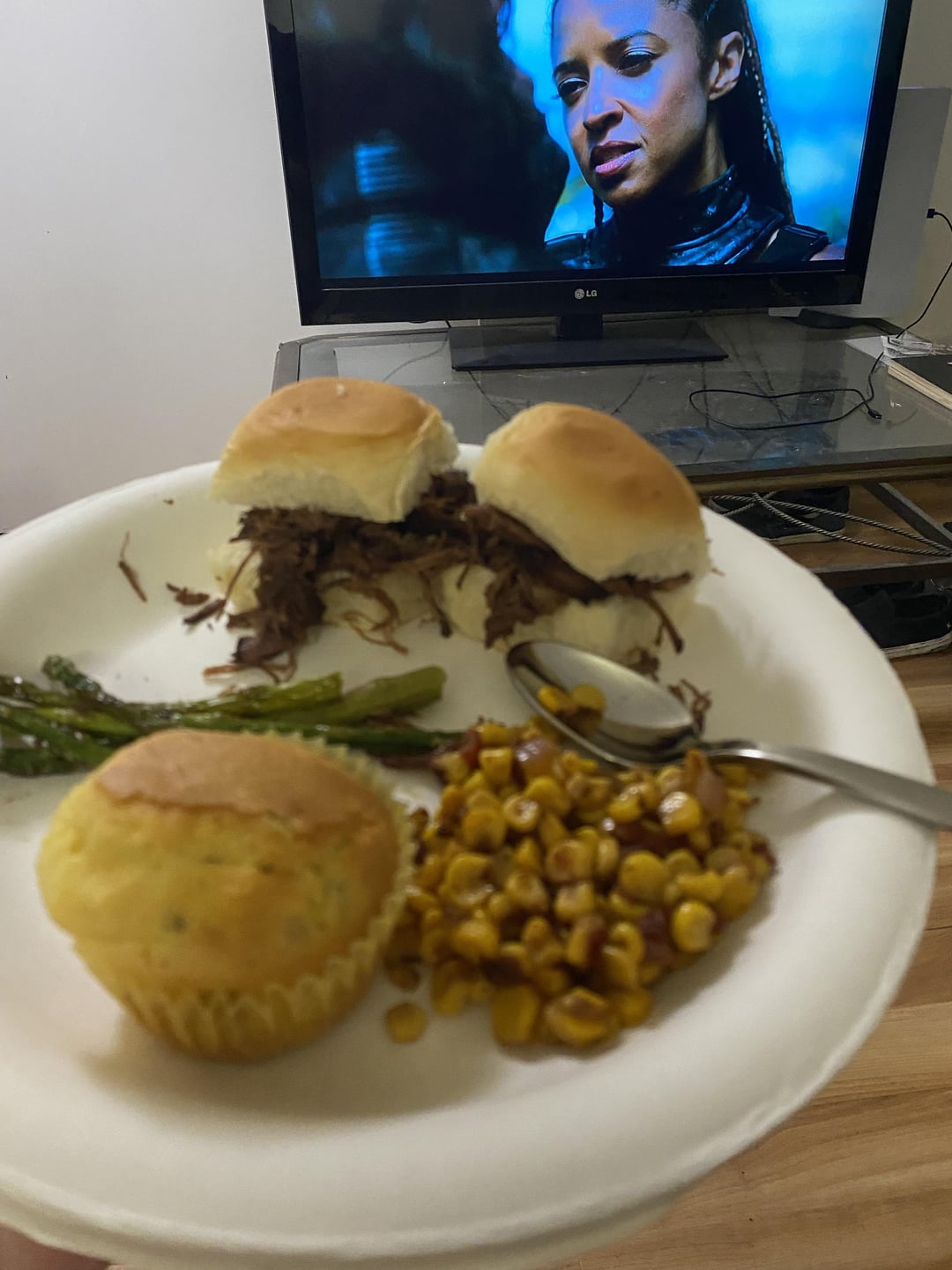Cast iron seared then 8 hours in the slow cooker on low, shredded and served with southwestern style corn, jalapeรฑo cornbread muffins, and grilled asparagus.by -Mwahaha- Write A CommentYou must be logged in to post a comment.