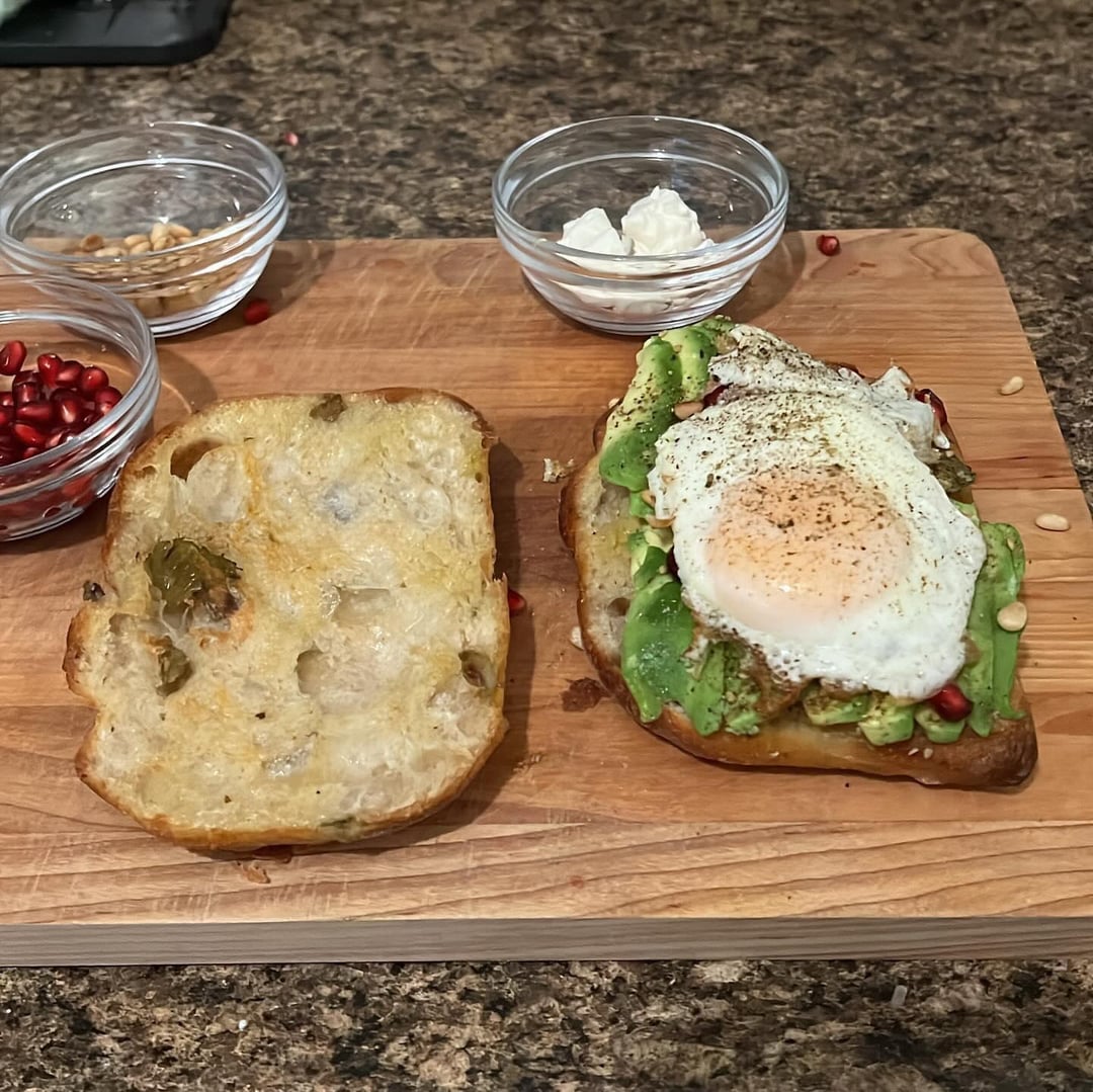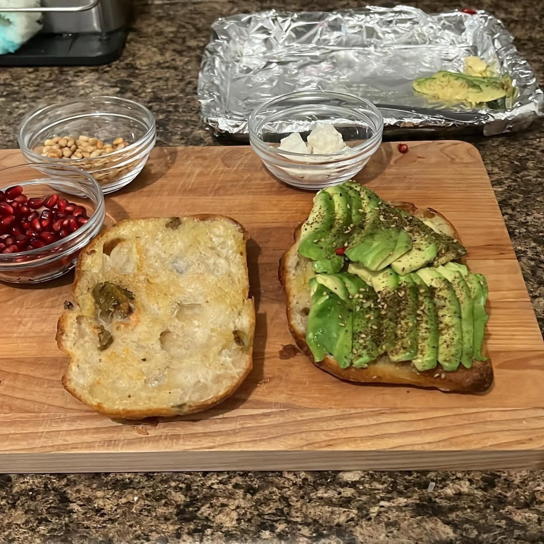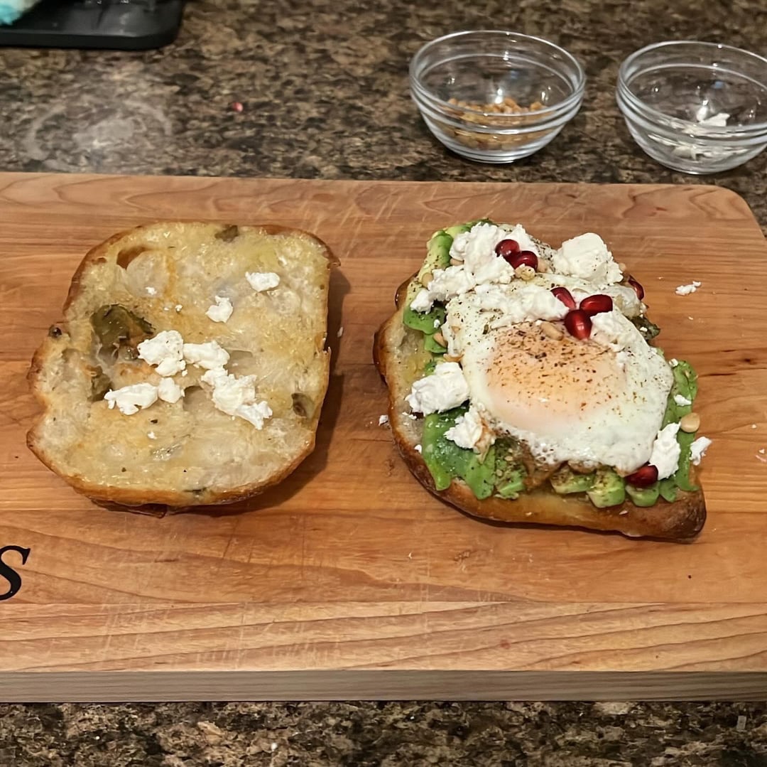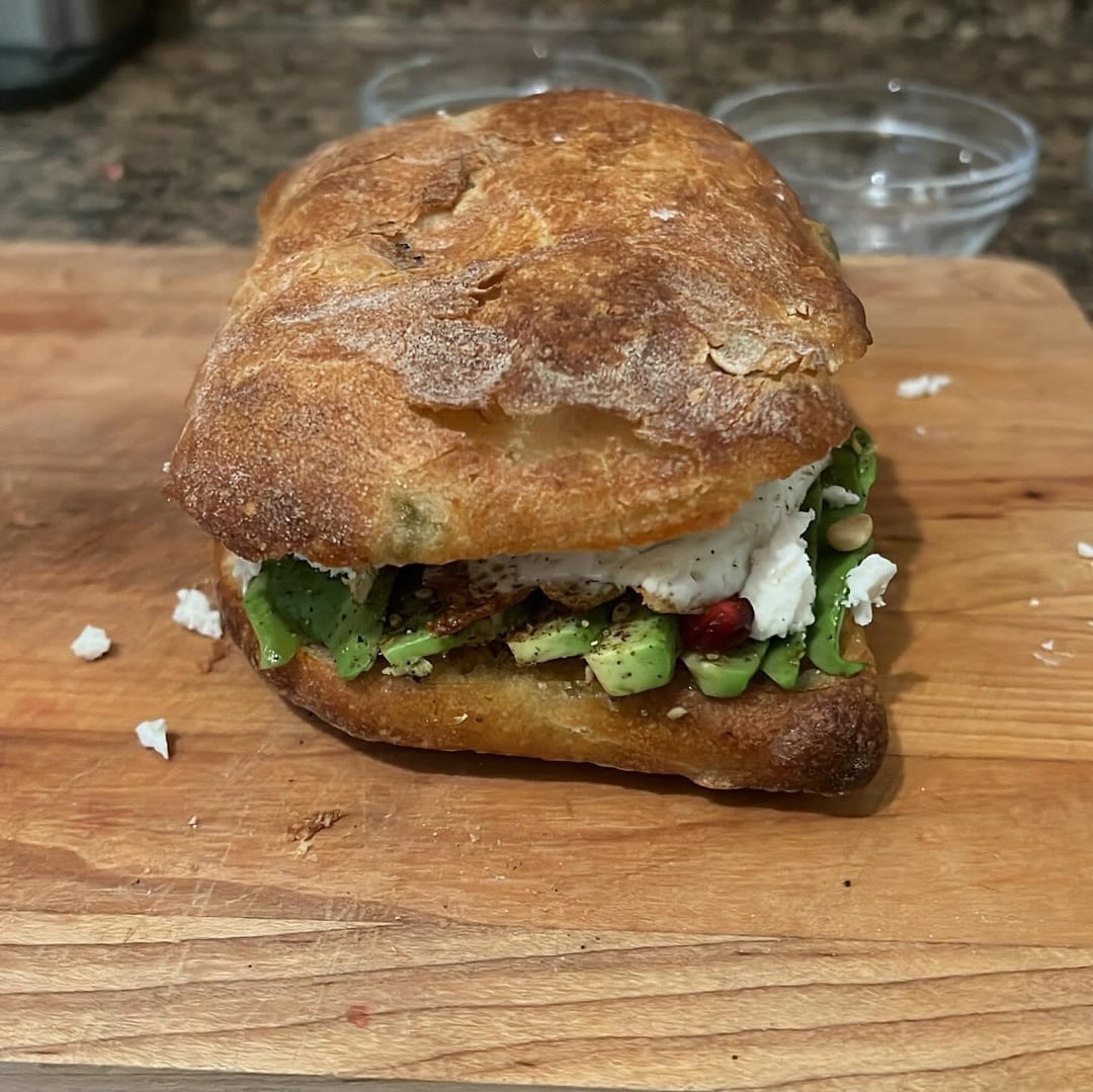 Fried egg sandwich on an olive loaf with avocado dressed in Zataar and pepper, isigny spring butter, smeared roasted garlic, pomegranates, toasted pine nuts, and barrel aged Greek feta with Terra garlic & herb chips and extra pomegranates on the side