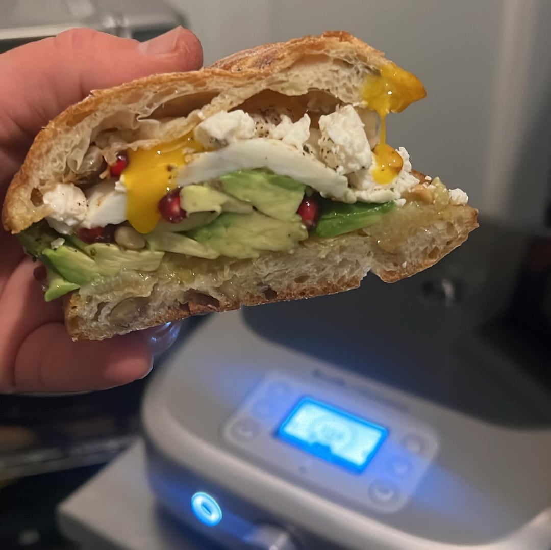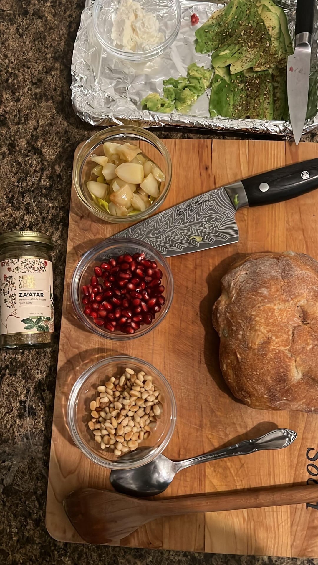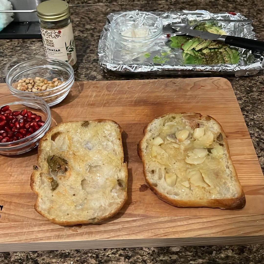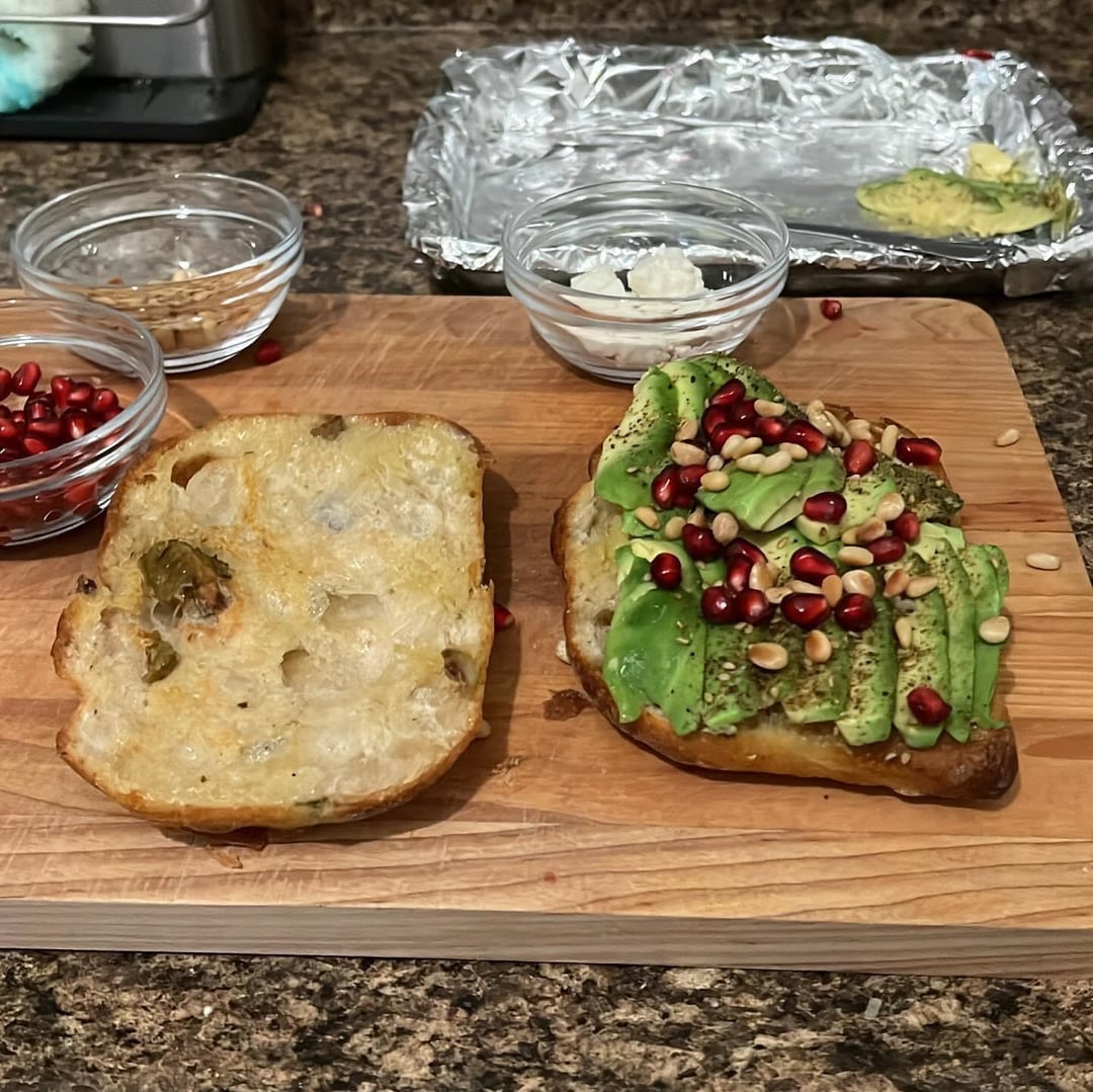 Fried egg sandwich on an olive loaf with avocado dressed in Zataar and pepper, isigny spring butter, smeared roasted garlic, pomegranates, toasted pine nuts, and barrel aged Greek feta with Terra garlic & herb chips and extra pomegranates on the side