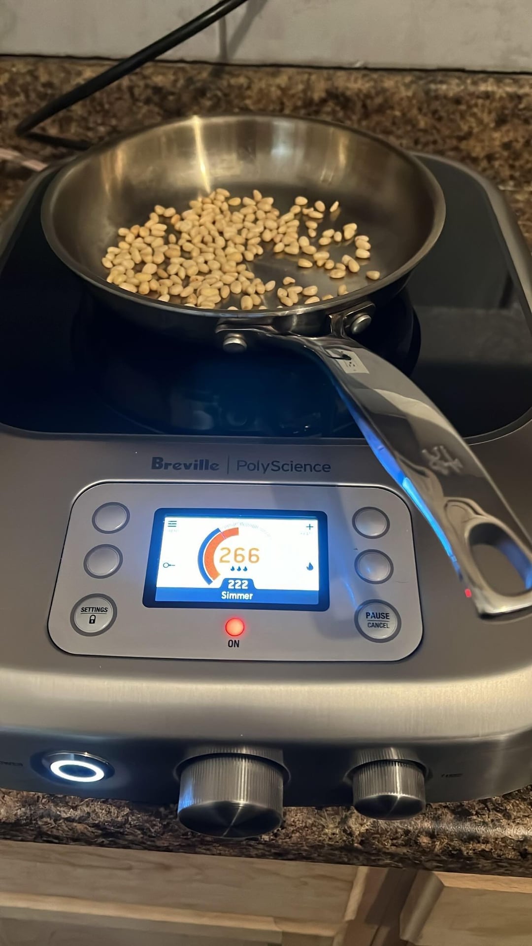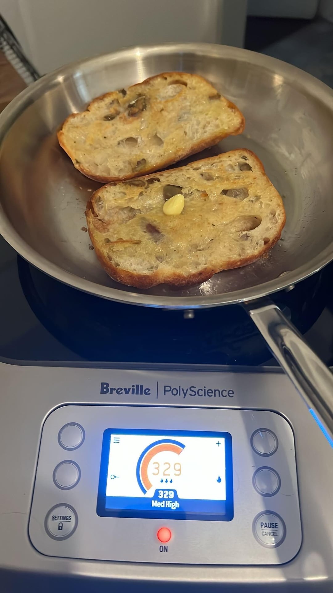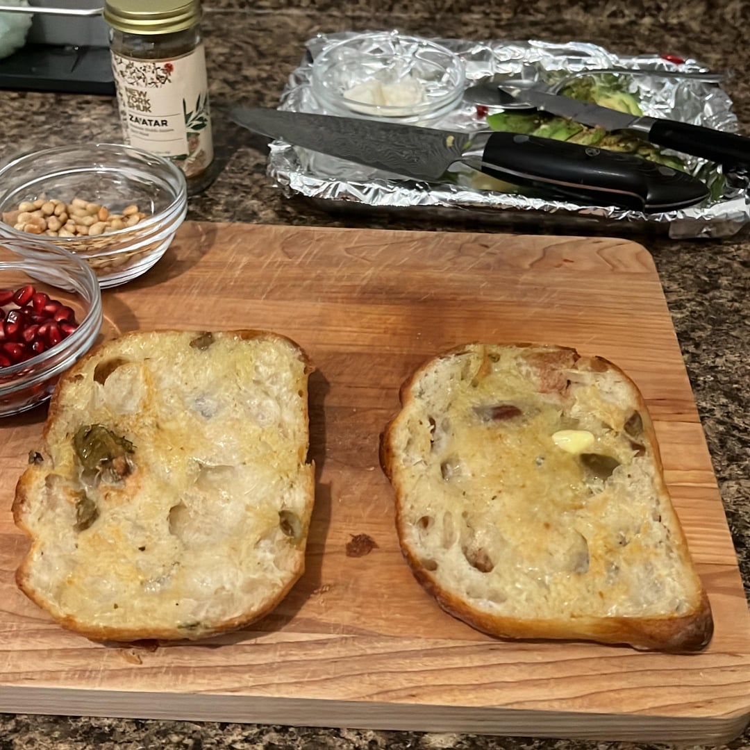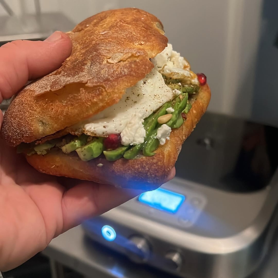 Fried egg sandwich on an olive loaf with avocado dressed in Zataar and pepper, isigny spring butter, smeared roasted garlic, pomegranates, toasted pine nuts, and barrel aged Greek feta with Terra garlic & herb chips and extra pomegranates on the side