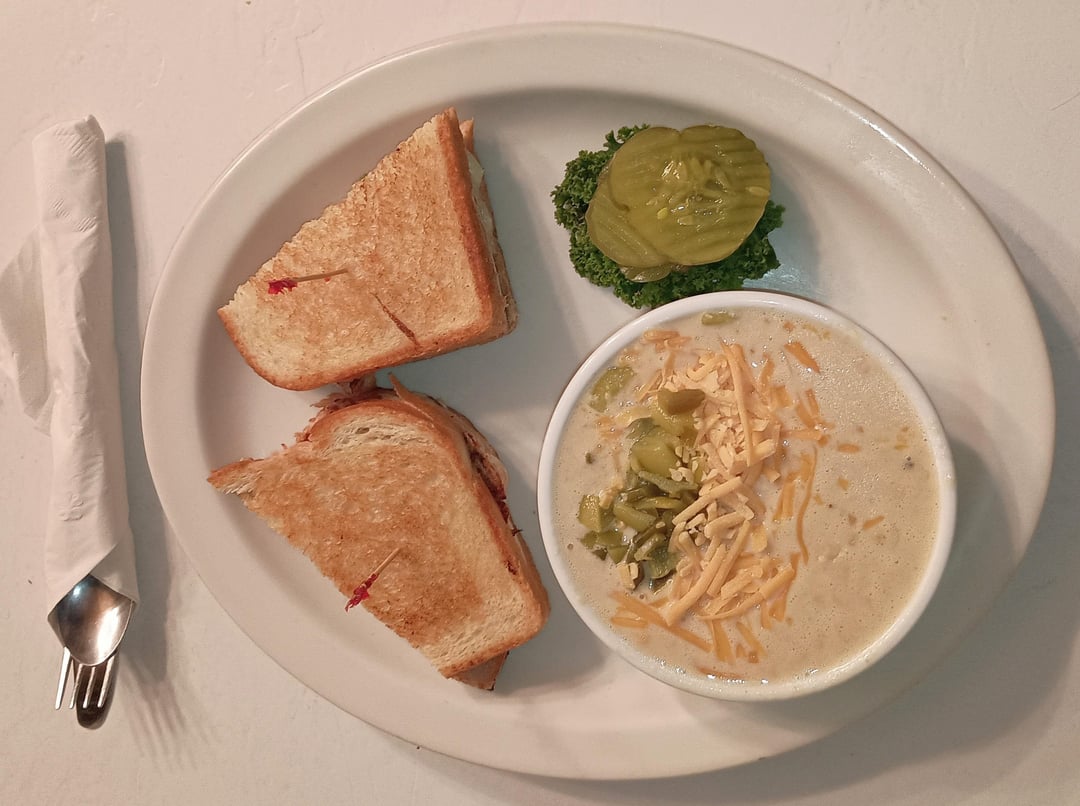 Turkey Melt on Sourdough with Swiss and Tomatoes. Served with Soup or Salad, I chose Corn Chowder and added Green Chilies, Jalapenos and Cheddar Cheese.