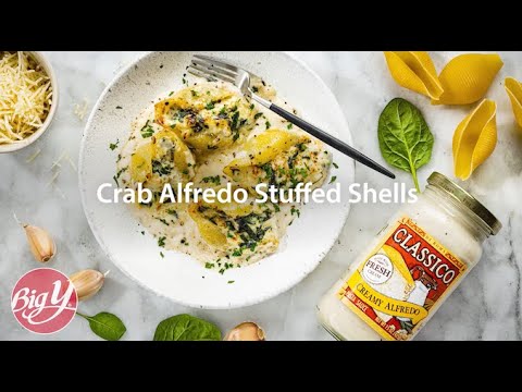 Get full recipe at: https://www.bigy.com/rs/recipes/crab-alfredo-spinach-stuffed-shells/15497