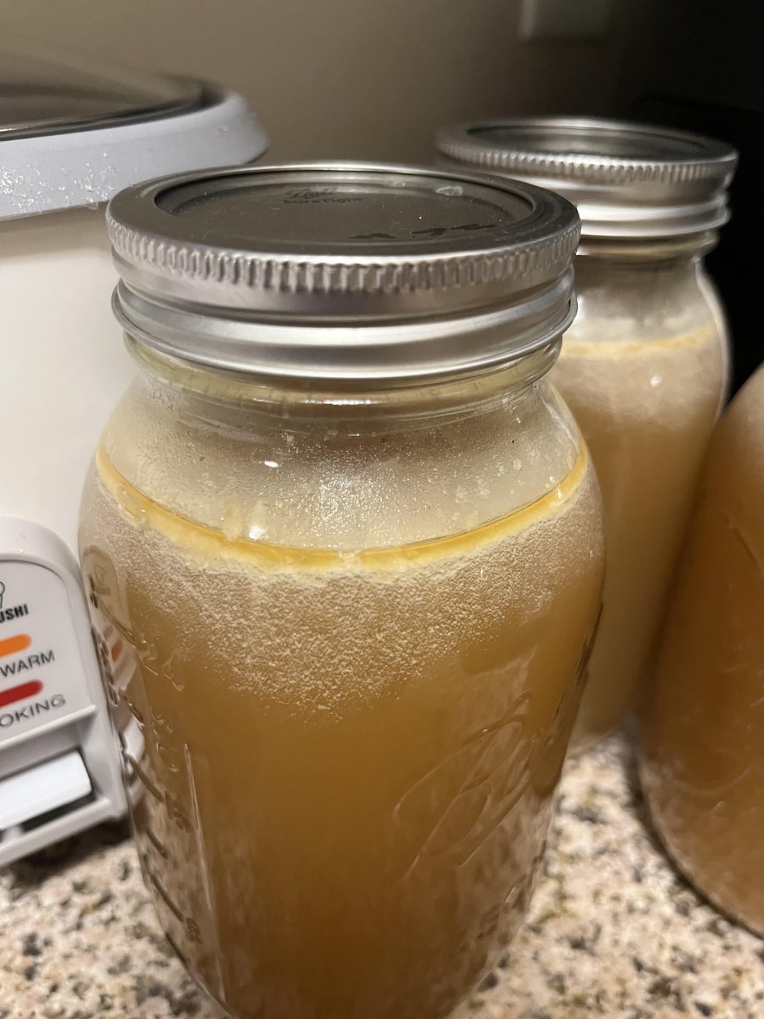 If you didn’t keep your stockpot at a low simmer, you’re more likely to get cloudy stock. This doesn’t mean it’s unsafe. Even clear broths can get a layer of murky floaties (coagulated proteins) under any fat remaining in the broth. I make my broths in an instant pot, so they always look like this…