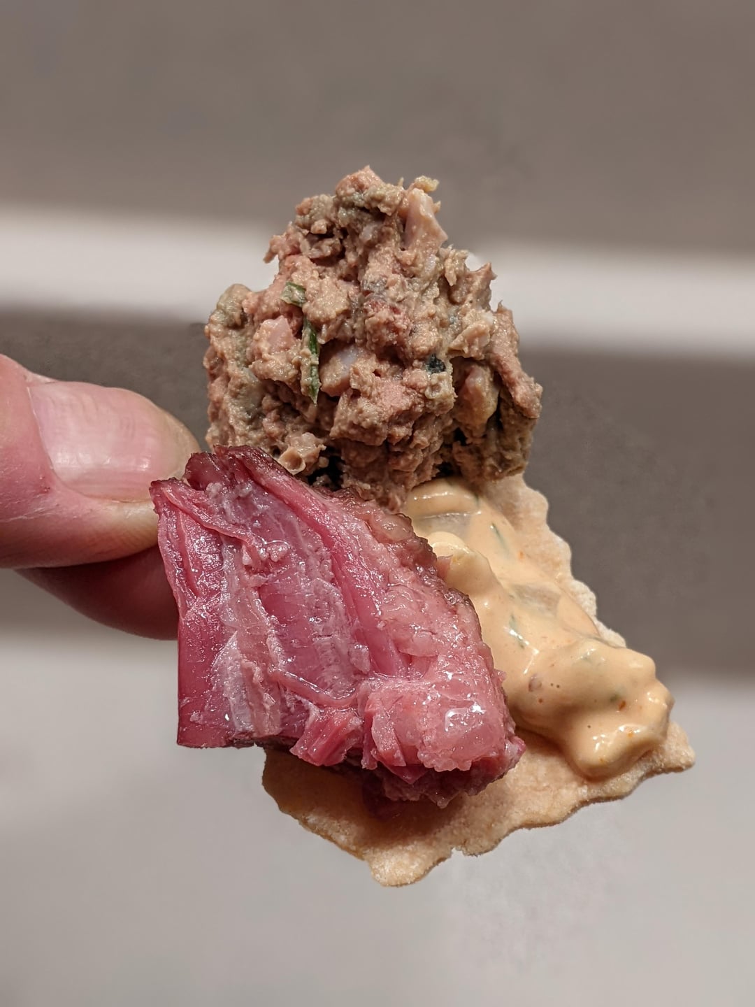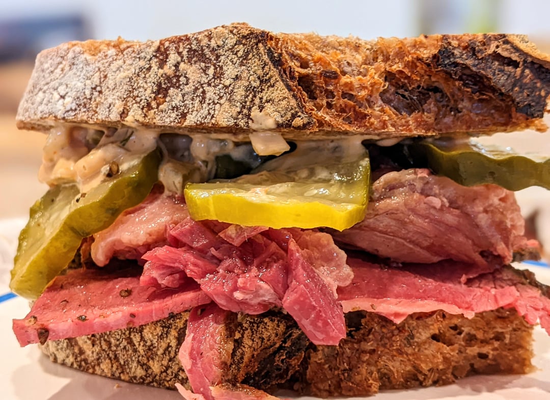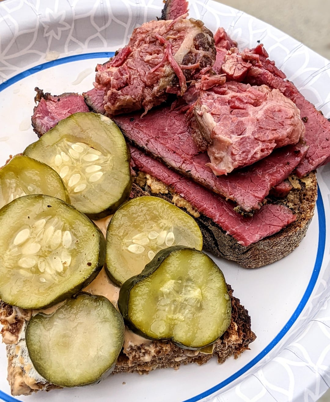 All scratch-made: pastrami, corned beef, smoked chopped liver, garlic dill pickles, 3-year fermented hot mustard, Russian dressing, pastrami-seasoned sourdough rye bread, enough for me plus 9 friends <swipe>