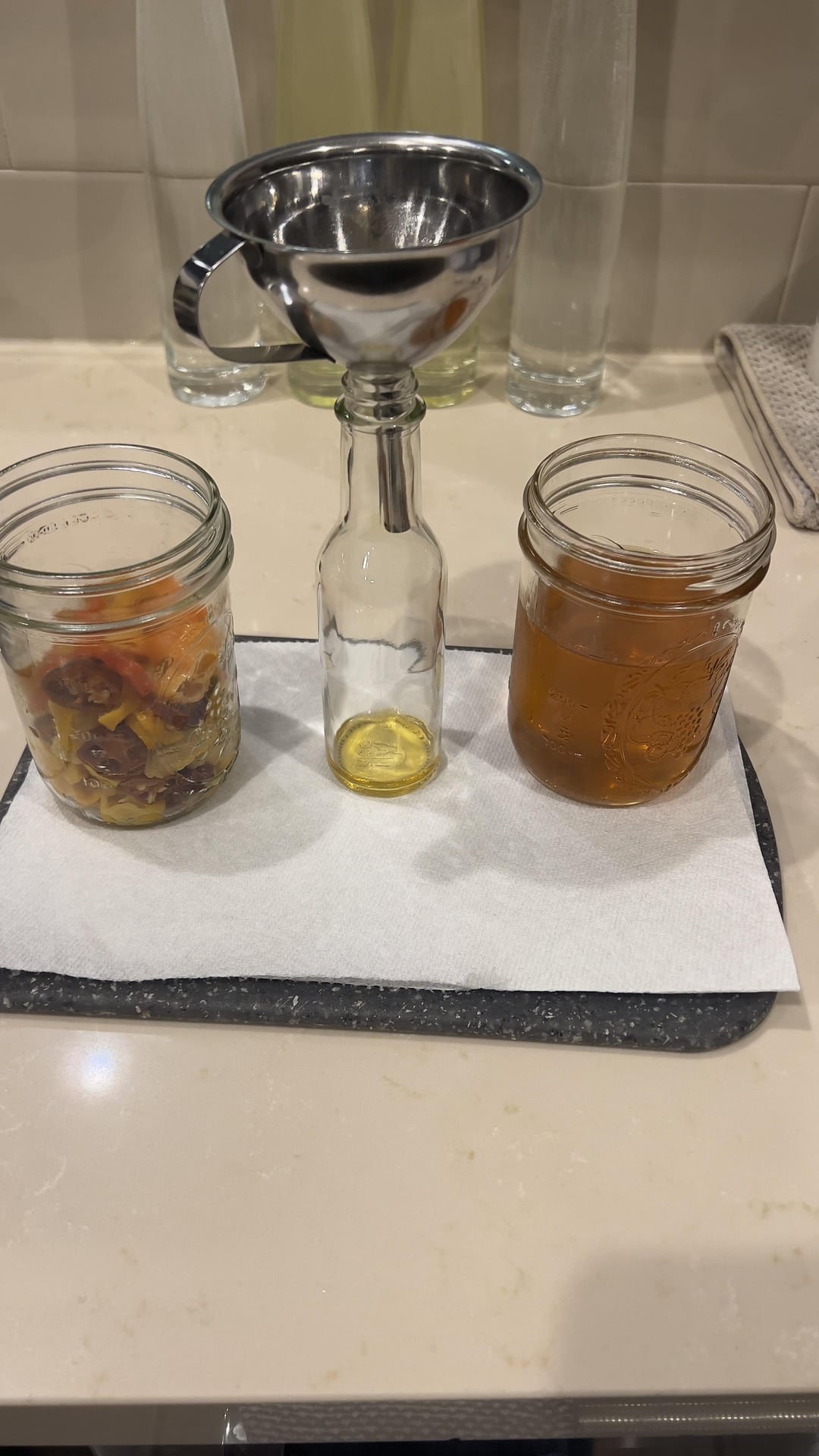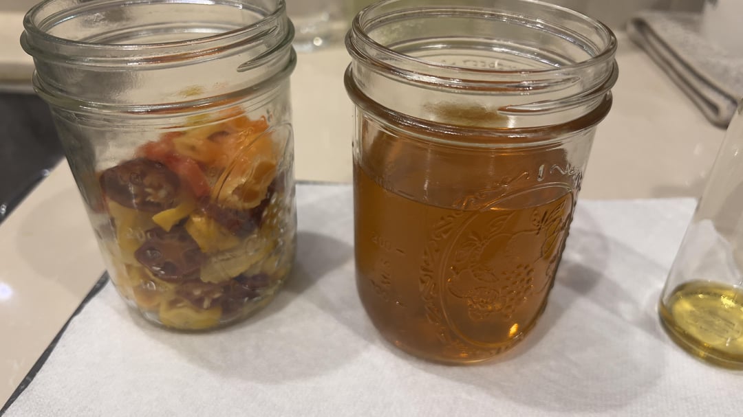 Ghost Peppers after 6 months in 200 Proof ethanol. The extract is filtered through coffee filter to remove all solids. In total, about 18-20 ghost peppers in 16 fluid oz of Ethanol (Culinary Solvents 200 proof organic food grade ethanol). Sealed in mason jar 6 months (forgot about it in the back of the cupboard) Some peppers were purple, others red and orange. Result was a beautiful amber extract. I tasted one of the extracted pepper to see how much residual heat… still hot, but palatable. Most capsaicin is in the ethanol with some fruit juices/extracted water. I will blend the remaining pulp with fruits and other peppers for a milder ghost pepper sauce.