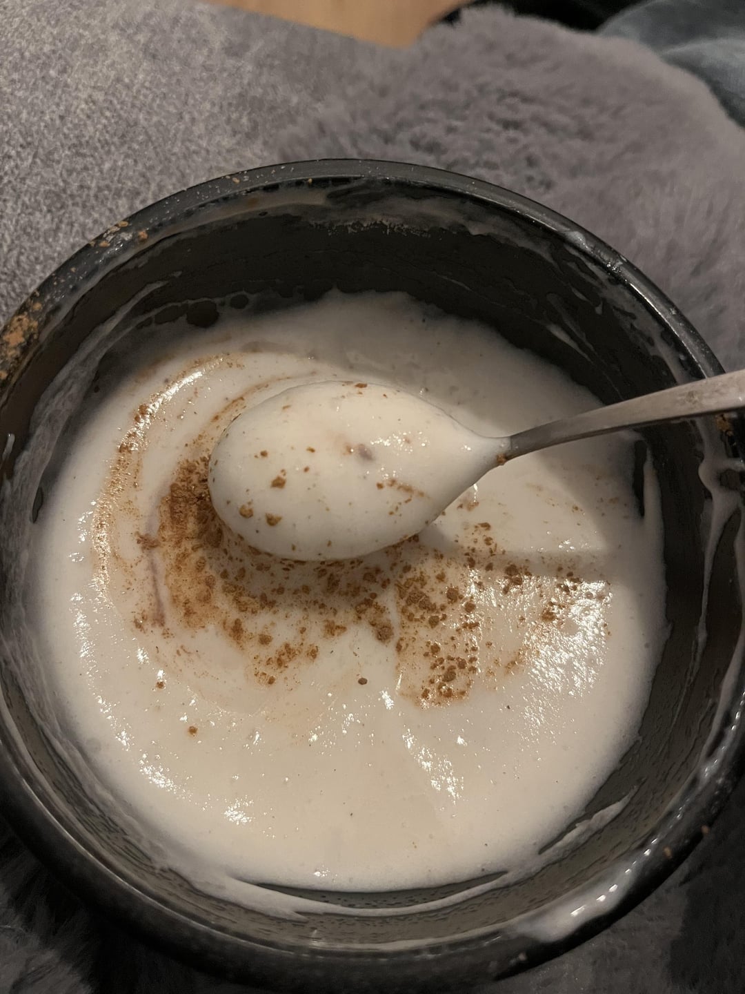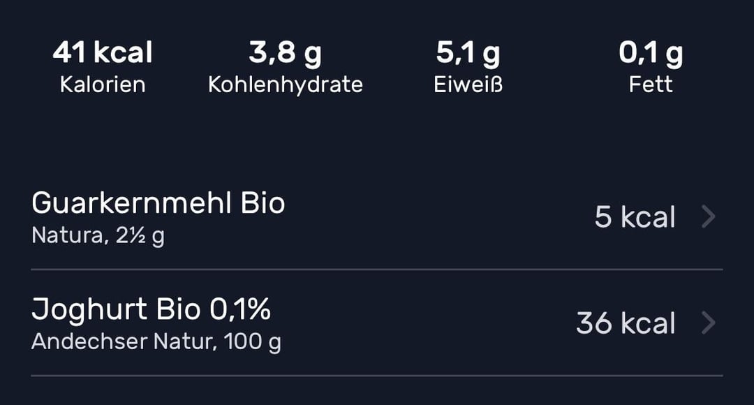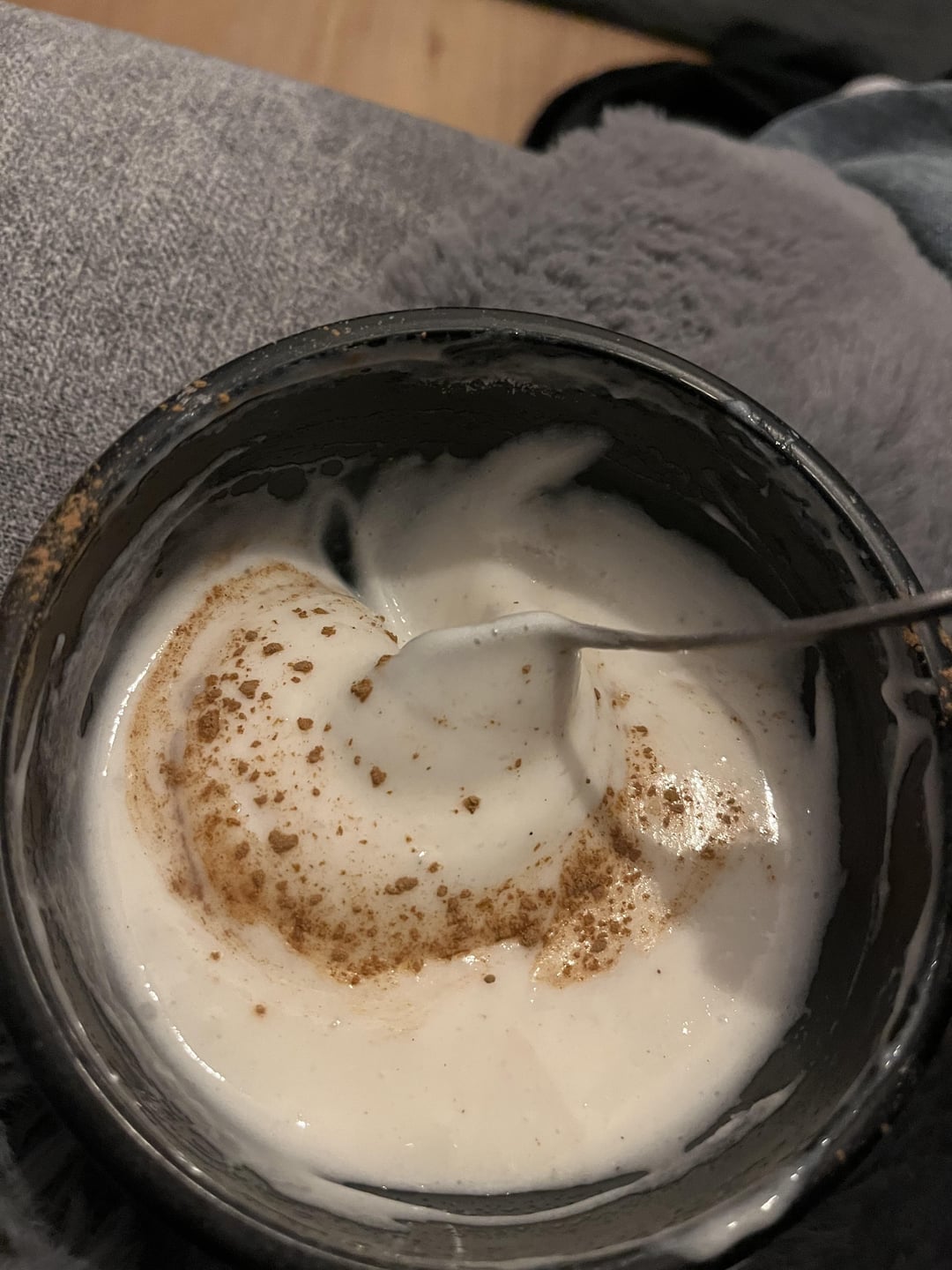 Recipe: Combine 100g 0,1% yoghurt with 100 ml water. While giving it a mix with an electric hand mixer/whisk add 2.5-3g of guar gum. Add your sweetener of choice and mix until it thickens (should take around 2 mins). And your done:) It’s super simple and the consistency is basically like the Joghurt before (or even a bit thicker and creamier) but double the volume. I included which yoghurt brand I used + nutritional info. I also used apple strudel sweetener and it was so good with a bit of cinnamon. I want to try and do this recipe next with skyr or quark for more protein.