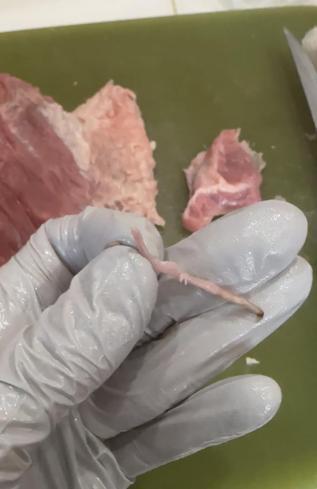 I got a whole brisket from a national retail chain in the US. As I was portioning it, I found these worm-like things. You can see the second one to the left of the one I’m extracting. Both of them were poking out of the same hole. So, are these parasites or something else?