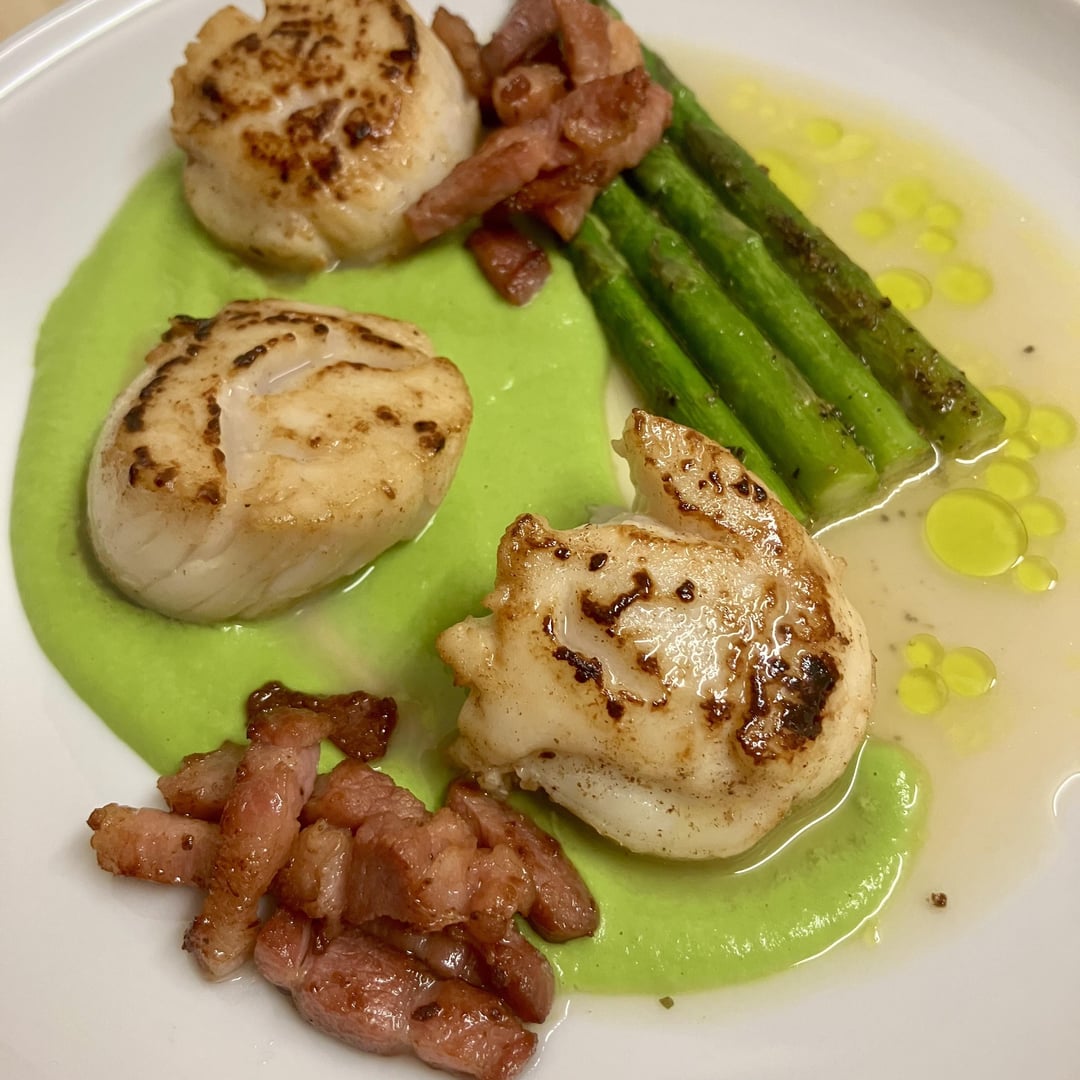 Seared Scallops with Bacon, Pea Purée, Chargrilled Asparagus and an Onion Broth