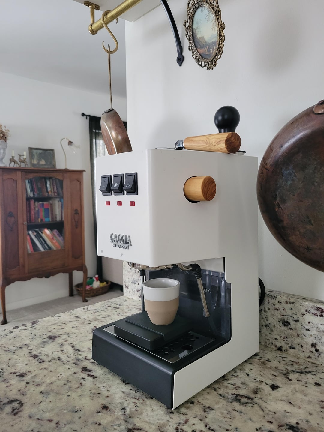 Gaggia classic evo pro from WLL with the 9 bar spring. KinGrinder k2 grinder Miicoffee scale Mii coffee leveling tamper Home made cork and sewing needle wdt tool!