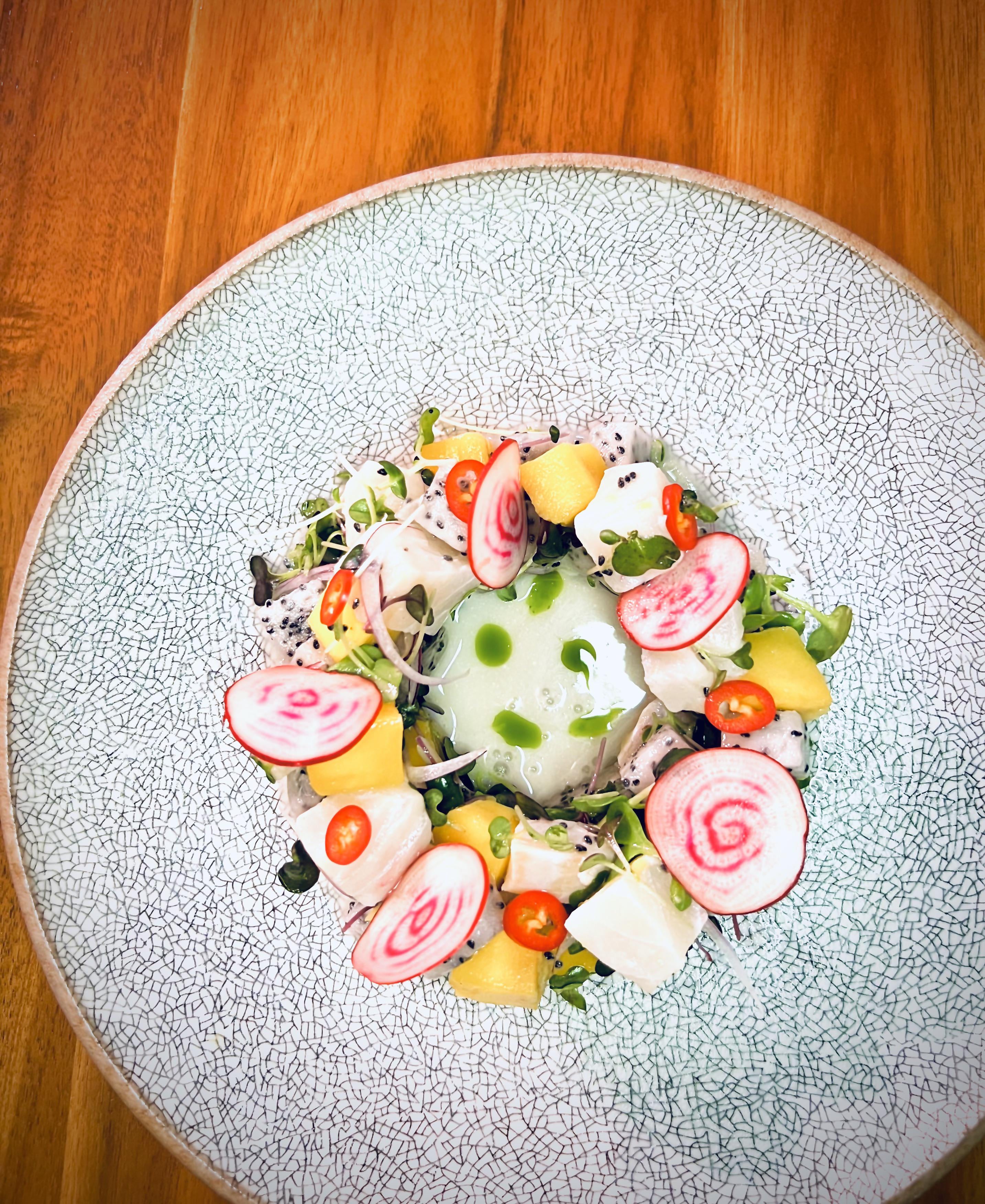 Coconut Lichee Verjus marinated mahi-mahi with dragon fruit and mangoes salad, fresno chili, cilantro oil.
