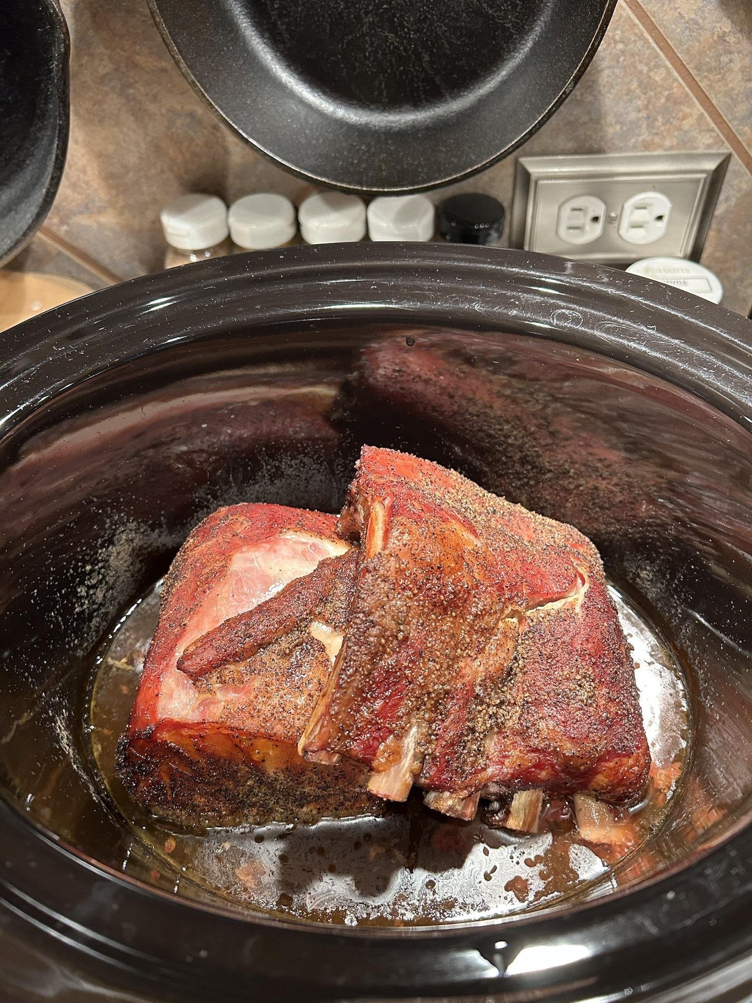 JohnnyBrillcream 2 years ago 1/3 rack and 1/3 loin. Rub equal parts salt and pepper.I “cheated”, put them on the smoker for an hour to get real smoke flavor. Add 1/2 cup chicken stock and cook on high for 5 hours.[Shredded loin](https://i.imgur.com/coQAenM.jpg)