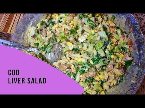 Cod liver salad with eggs, spring onion and cucumber.