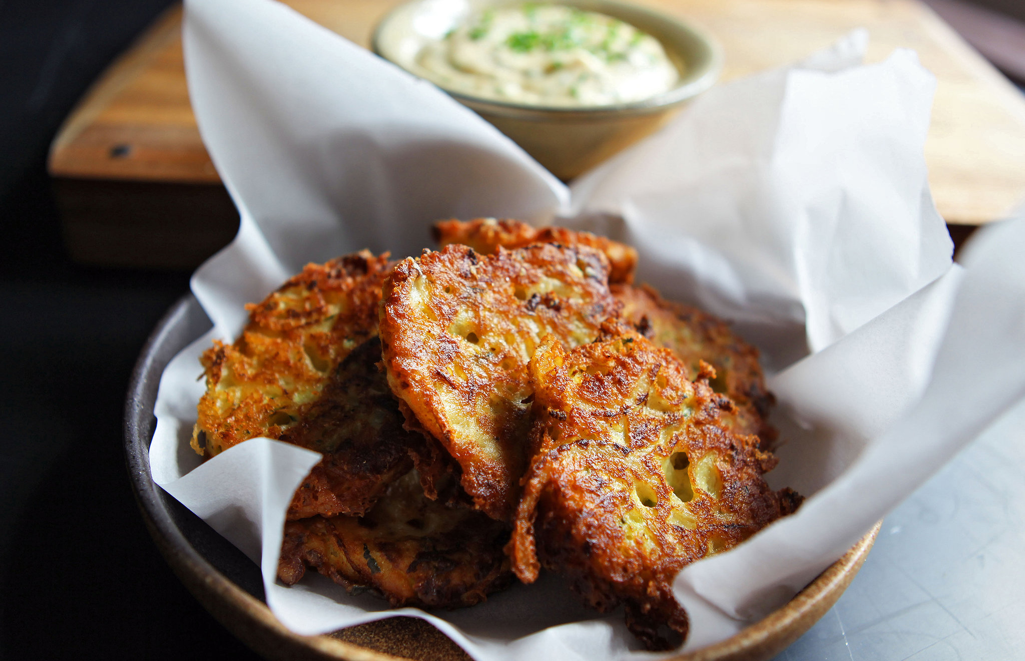 - Heat canola oil in a large heavy-bottomed skillet over medium-high heat. Drop about 1 tablespoon of batter into the oil per fritter and fry 6 fritters at a time until golden-brown, 2 to 3 minutes a side. Remove to paper towels to drain. Serve hot, with the sauce on the side.