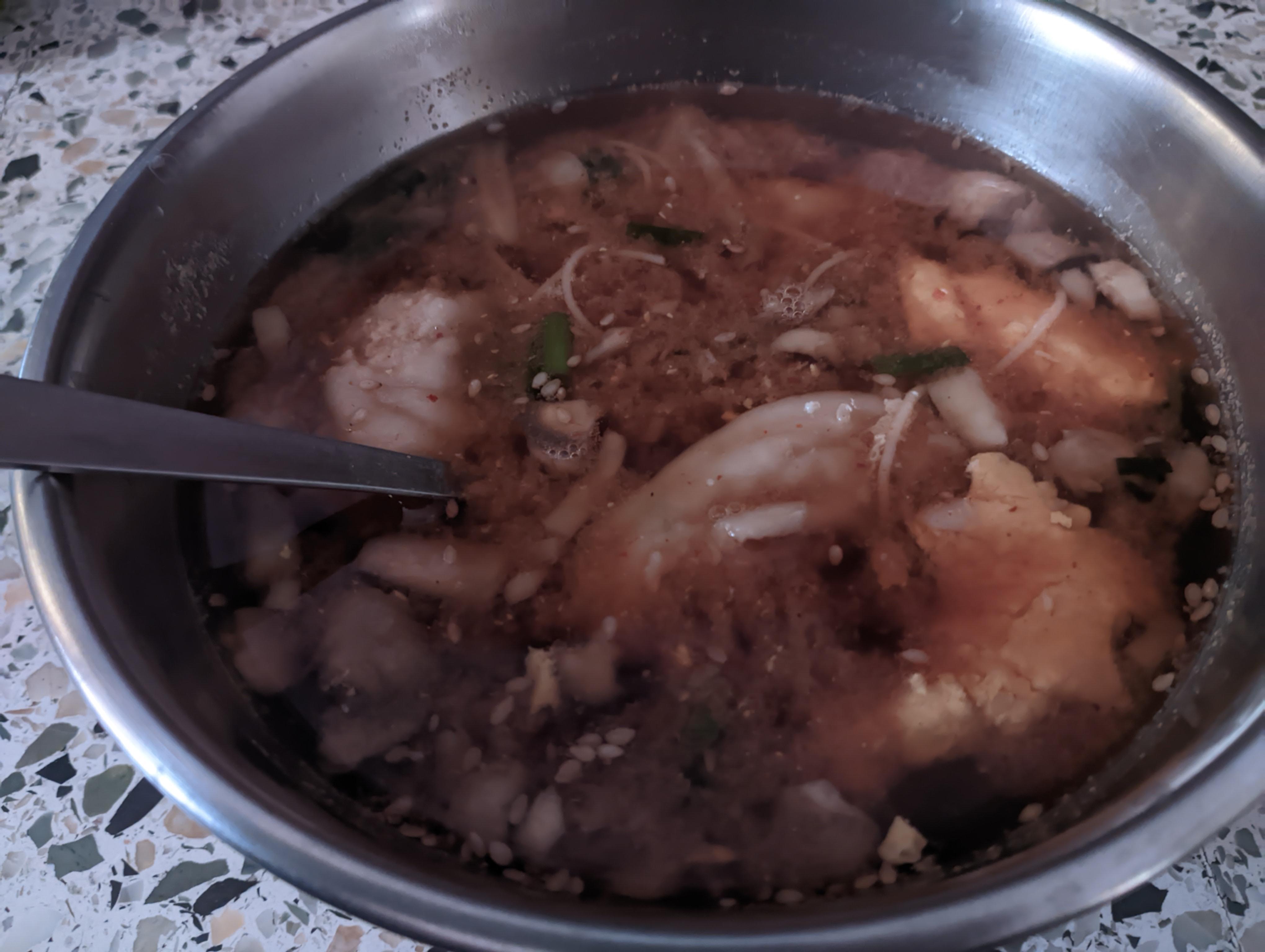 Indian wheat shevai noodles (wheat vermicelli), Homemade fresh kimchi, spring onion, toasted sesame seeds, ginger, garlic, Kuti Mirch coarsely chili powder (looks exactly like Gochugaru), homemade wontons, Mushroom, Oyster Sauce, Dark Soy Sauce, sriracha sauce,tiny sprinkle of yumyum, salt, corn and an egg
