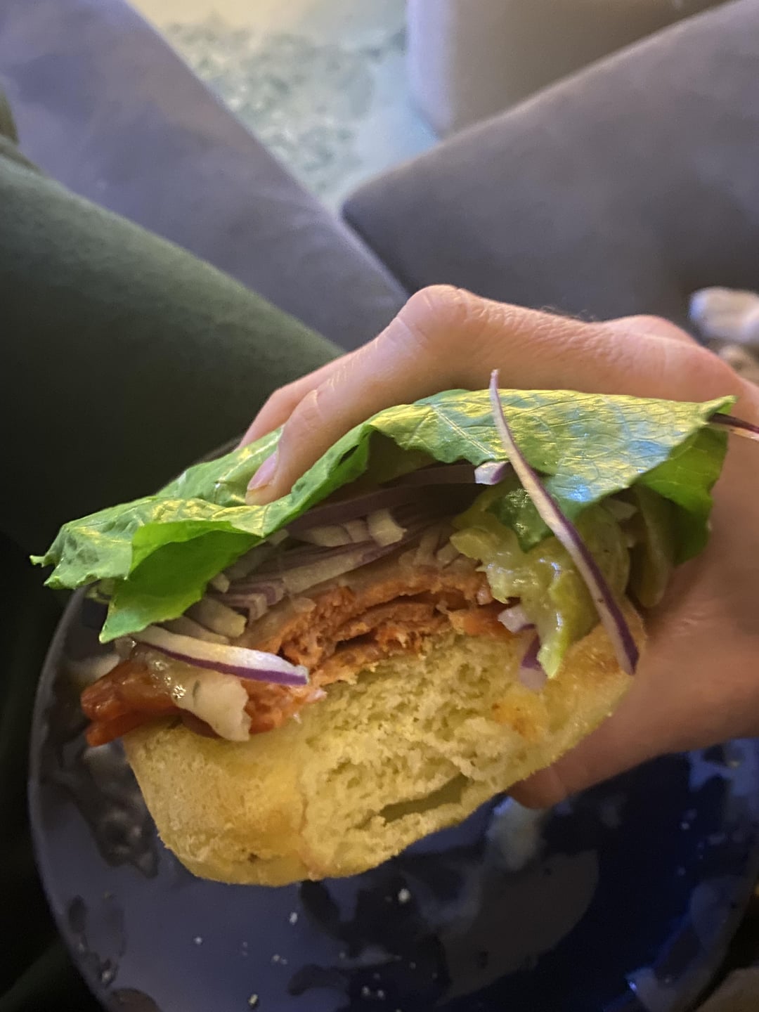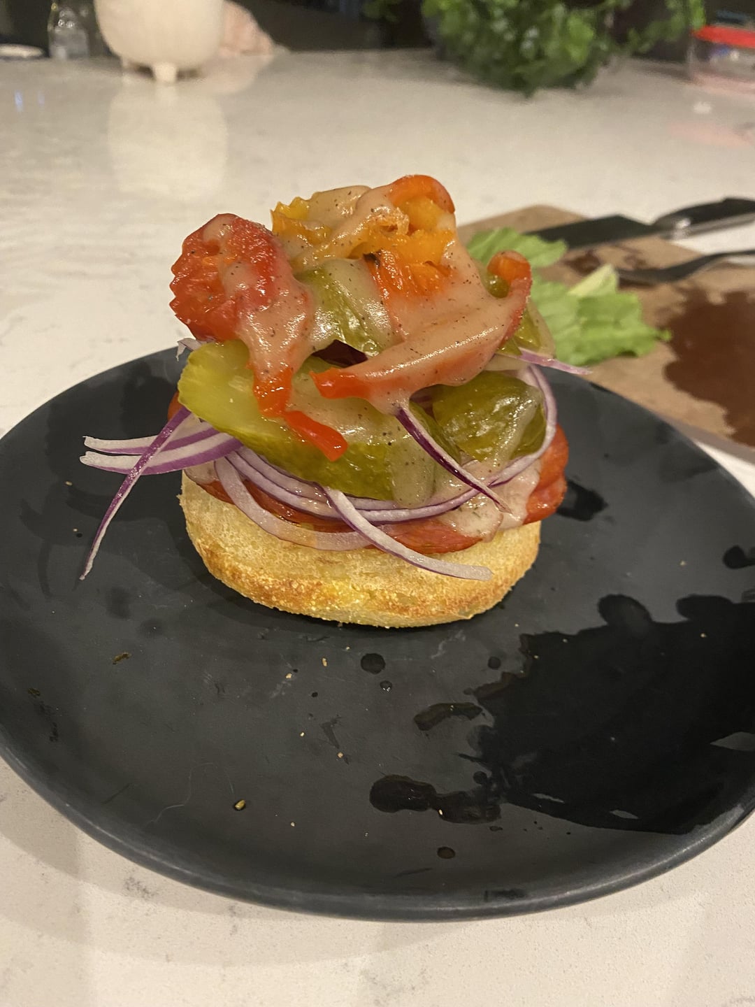 A while back I posted my Magnum Opus…and now…behold this late-night creation made of fridge scraps on a GF english muffin. Tasted surprisingly good!
