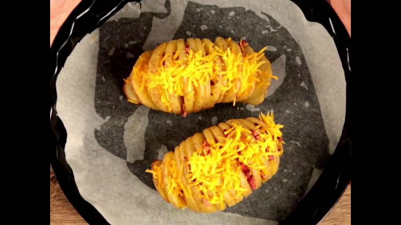 Add the fried bacon and the Cheddar cheese into the space between the potato slices.