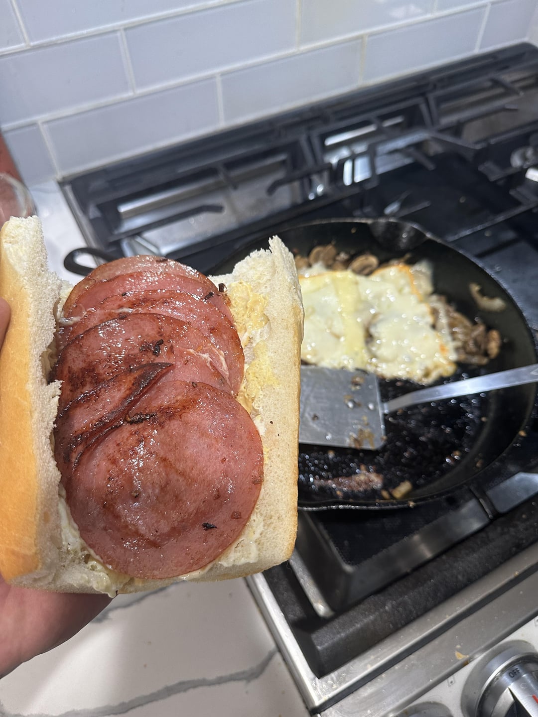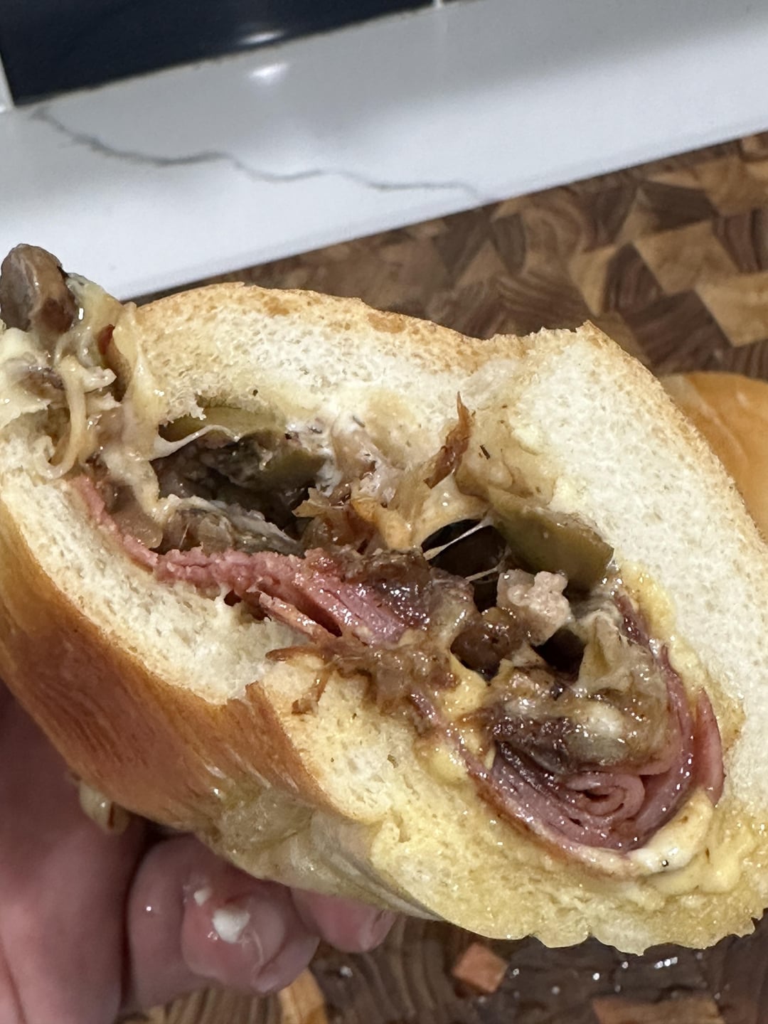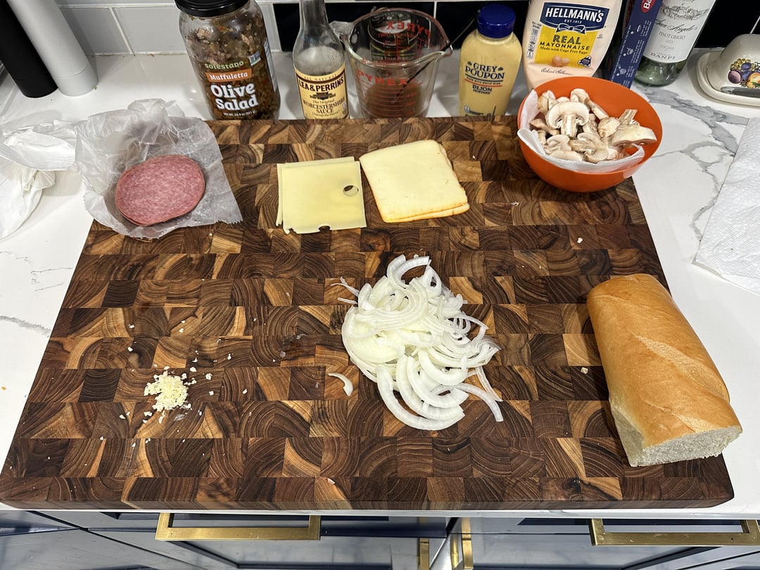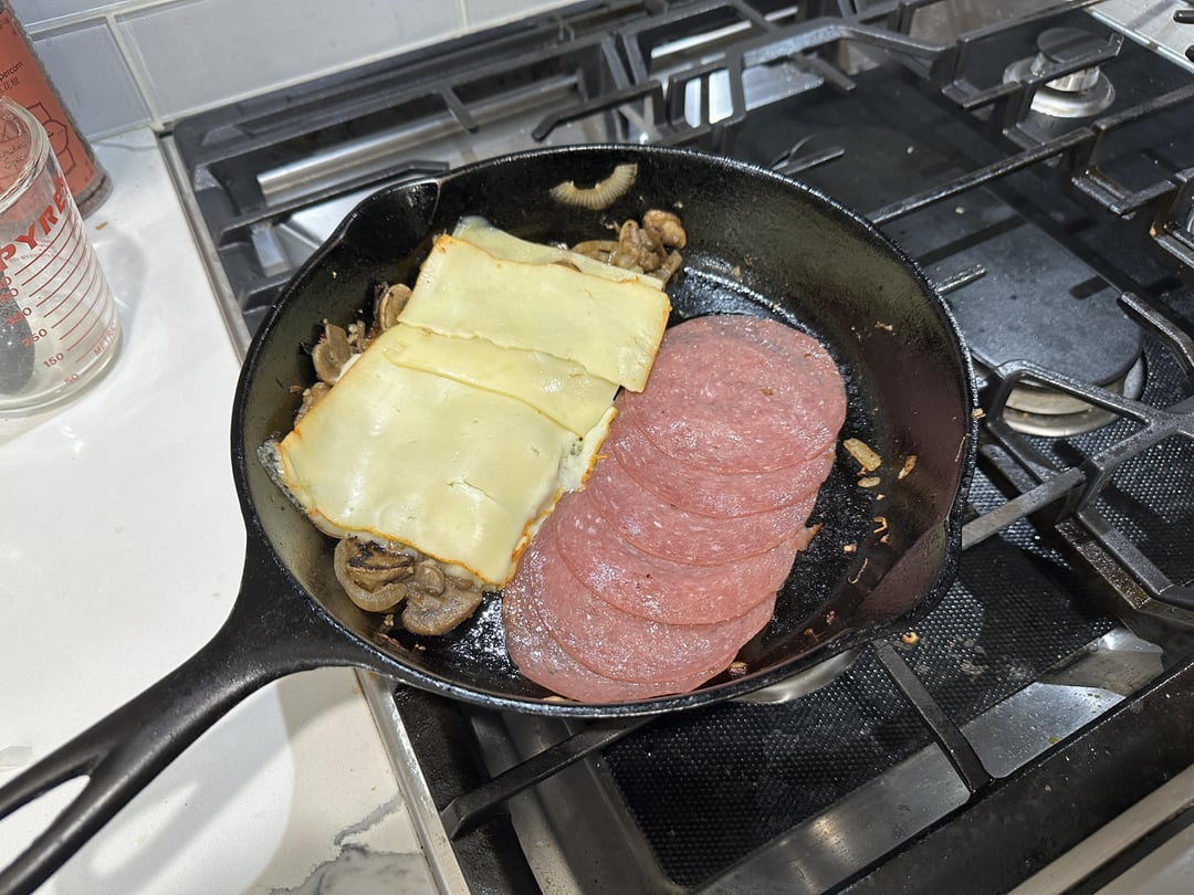 salami, swiss and muenster w/ sautéed mushroom and onion, dijon and mayo. muffaletta mix on top.i gotta be honest. it’s 3:34am and im pretty high, but this was really good.by callmestinkingwind Write A CommentYou must be logged in to post a comment.