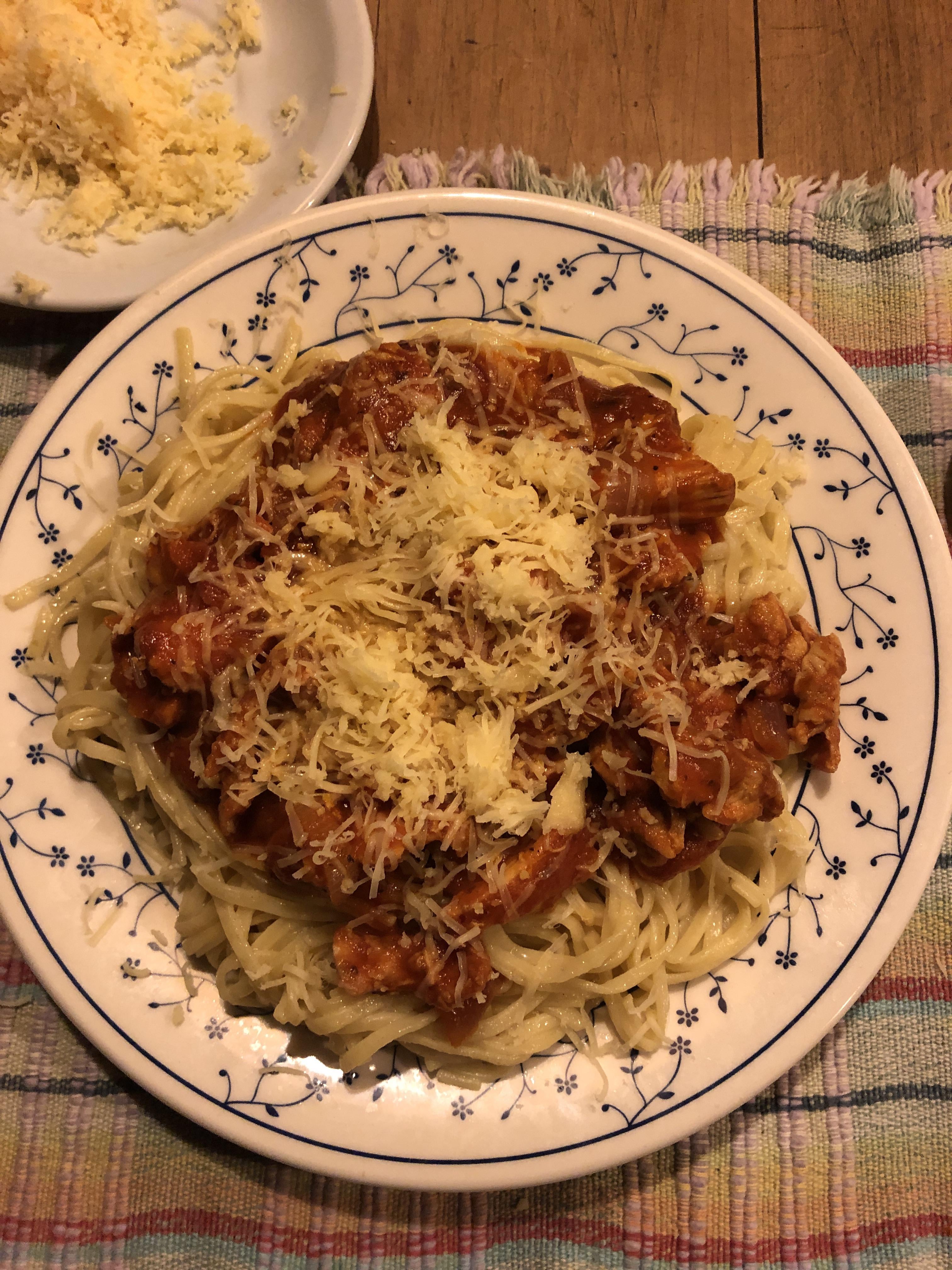 Pour the rich tomato and chicken sauce over the plated spaghetti.