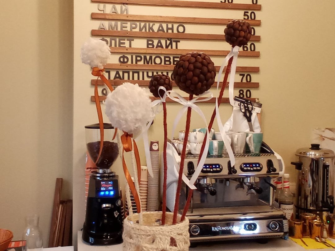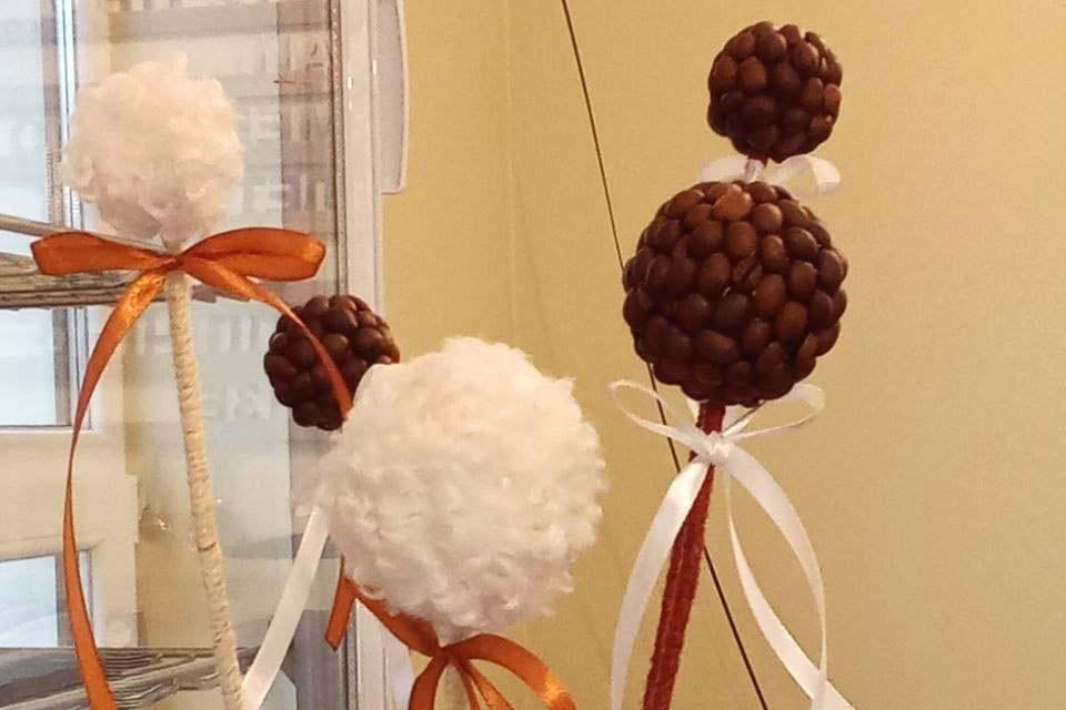 How do you like the decor element for a coffee shop? Balls on stems, trimmed with natural grains and faux fur (a la Raffaello)by JuteExtravaganzaEtsy Write A CommentYou must be logged in to post a comment.