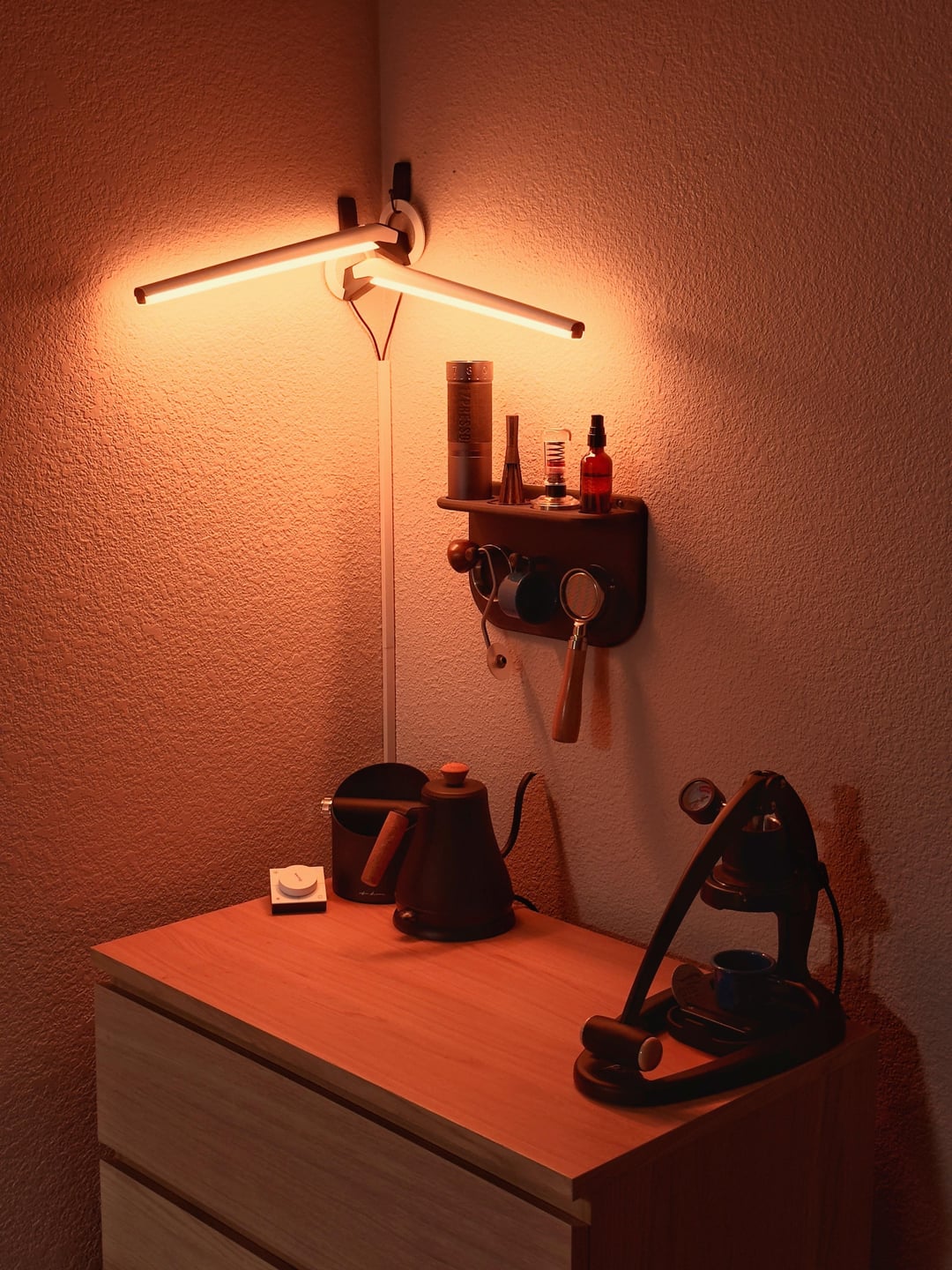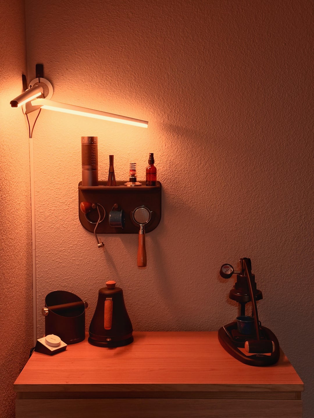 I have the Subminimal NanoFoamer Pro on the way (I pre-ordered it from their kickstarter). That’ll fill in the big gap on the counter and also leave me some room for future changes. The tamping mat, artwork for the wall, milk pitcher, and I can’t remember what else will fill in all remaining empty space without crowding things too much.