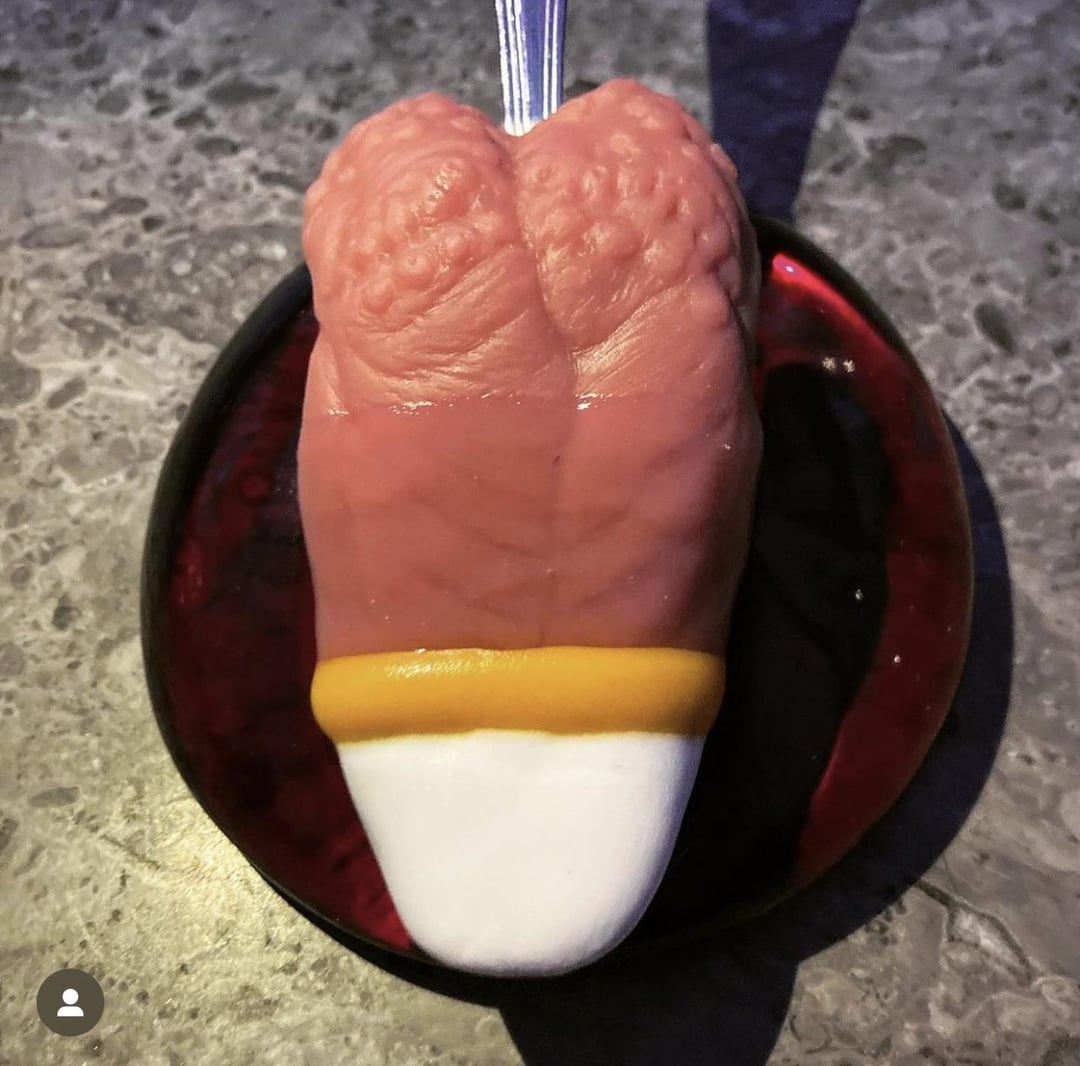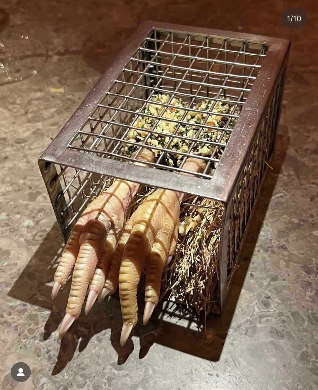 “…a caviar course is plated in the pupil of an oversized eyeball (this impression is called “1984”), and there is even a silicone human tongue coated with a candy-like substance which everyone is encouraged to French kiss in order to consume. (…) One of the final impressions, which speaks to irresponsible chicken farming, presents a chicken lollipop attached to a chicken foot imprisoned in a cage.”