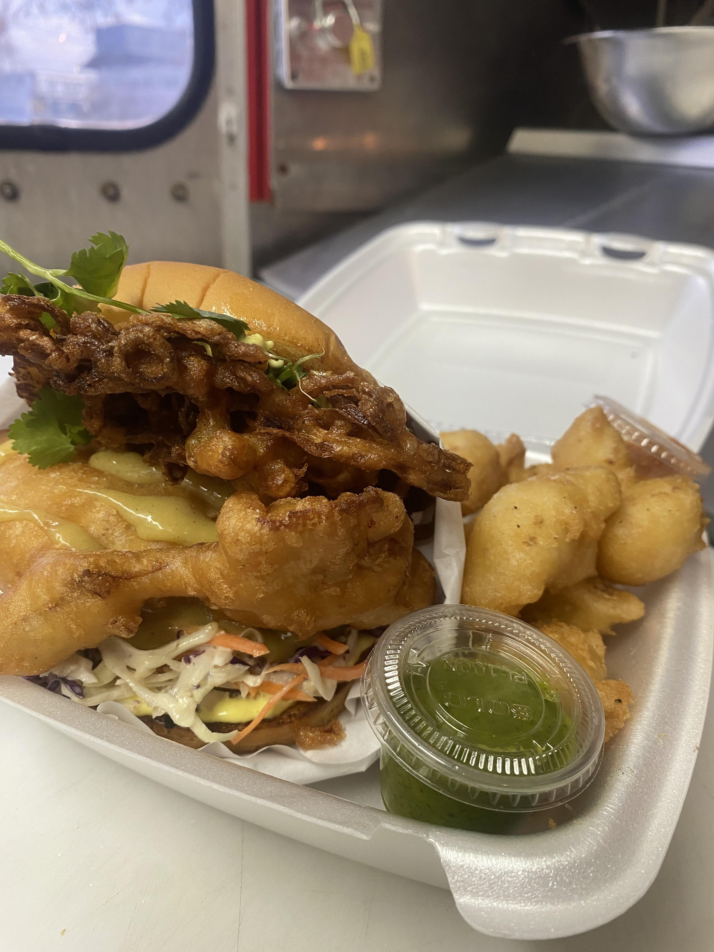 Also has a malt curry aioli, cilantro and fried onion pakora.
