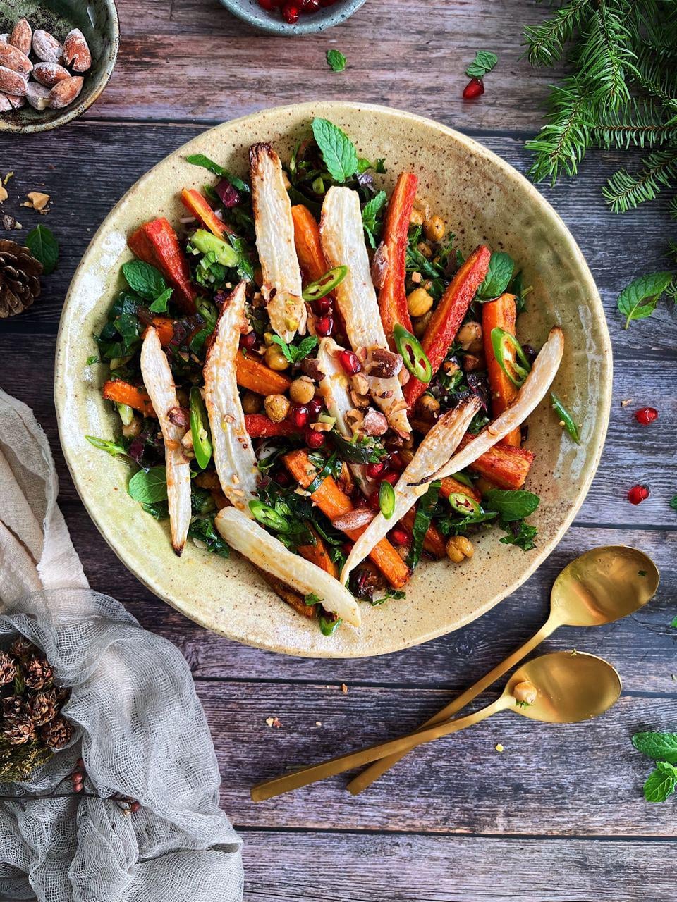 Roasted Carrots and Parsnip Salad with Chickpeas and Green Salsa