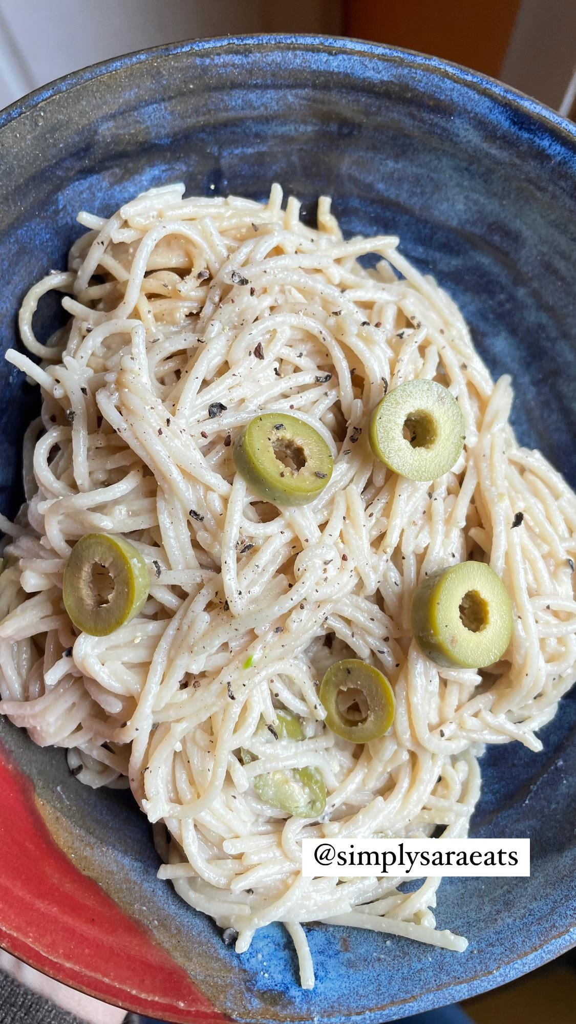 Directions: 1. Bring a pot of salted water to a boil and cook pasta as directed on package. Set aside about a cup of pasta water. PS if your salted water doesnβt taste like the ocean you are missing out!! This seasons the pasta within. 2. Over medium heat in nonstick pan, add a splash of water to prevent sticking. Then adding in garlic, cooking until fragrant. About a 30 seconds to a minute. 3. Turn heat down to low and add in cashew cream. Season with fresh cracked pepper, a couple dashes of coconut aminos, and salt to taste. 4. Stir in pasta adding in pasta water as needed to make things nice and creamy. Turn heat off and stir in your olives. Taste and season more to your liking if needed. 5. Serve and top with more olives if you are feeling wild like me.