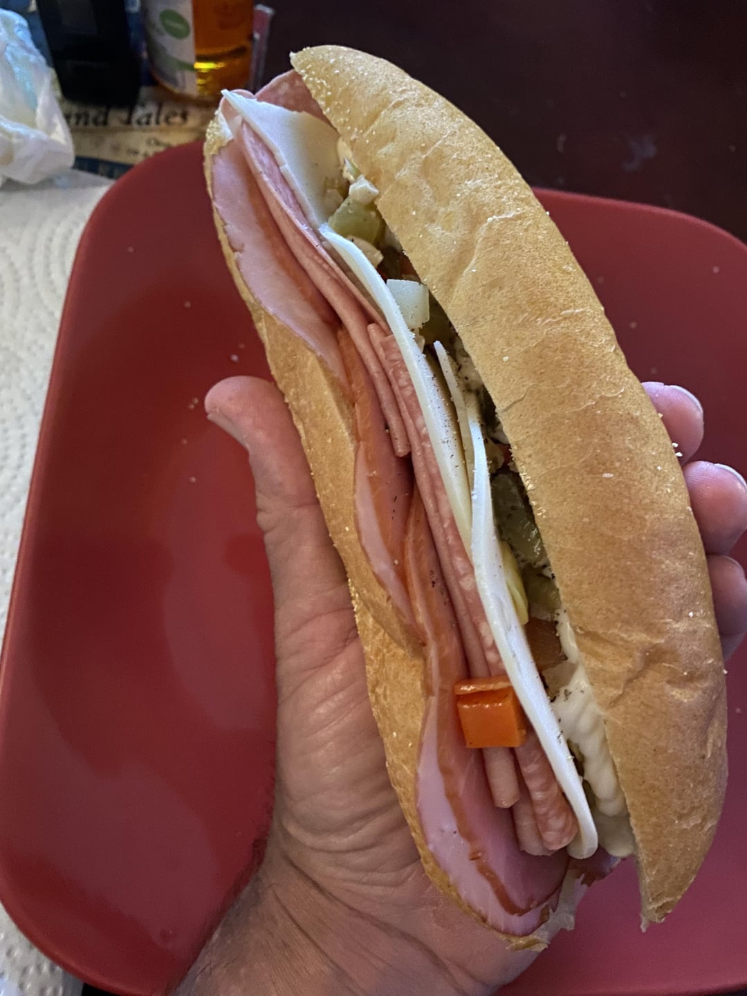 Boar’s Head Tavern ham, Genoa salami and mortadella, with provolone cheese, Giardiniera, mayo and a bit of black pepper on a bakery sub roll. It was totally rad.., one of the best sandwiches I’ve ever made!