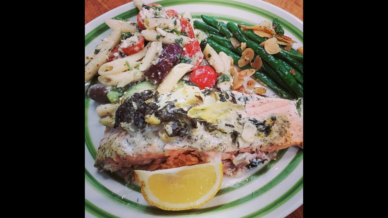 Hi guys welcome to the chef’s backyard I’m here with my beautiful assistant and tonight I’m going to show you how to make a delicious dill sauce and we’re gonna bake some salmon you ready to cook let’s go all right so what we’ve got here I’ve got some extra virgin olive