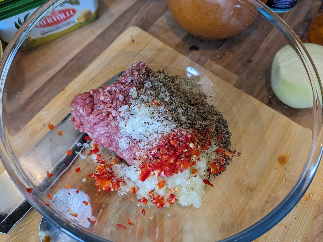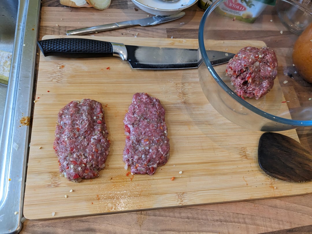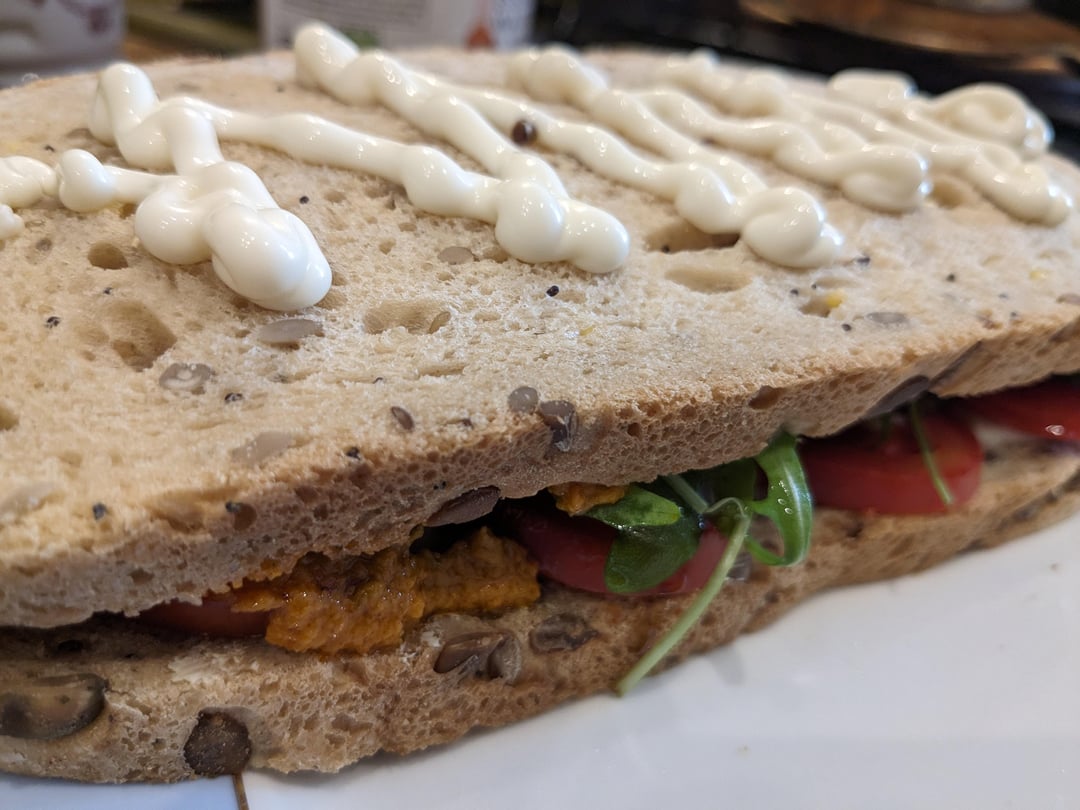 Seeded batch loaf, beef patties with salted tomatoes, rocket, mayonaisse and homemade fennel tomato sauce.